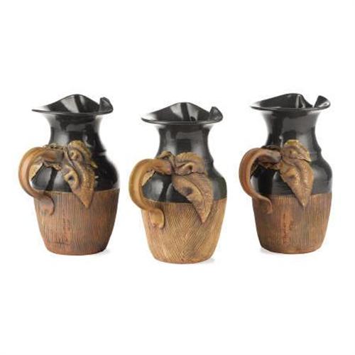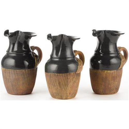 <B>Three American Ceramic Pitchers<BR></B></I>Terrafirma Ceramics USA<BR>1987<BR>The glazed greyish blue pitchers, the sides overlayed in a textural bisque finish biscuit colour with grapes and vine decoration<BR>Incised signature to the side <I>Terrafirma Ceramics USA 1987SE<BR></B></I>10.2 inches high x 5.5 inches wide<BR><BR><b>Shipping:</b> Requires 3rd Party Shipping (<a target="_blank" href="http://www.heritageauctions.com/common/shipping.php">view shipping information</a>)