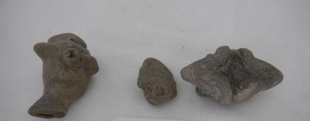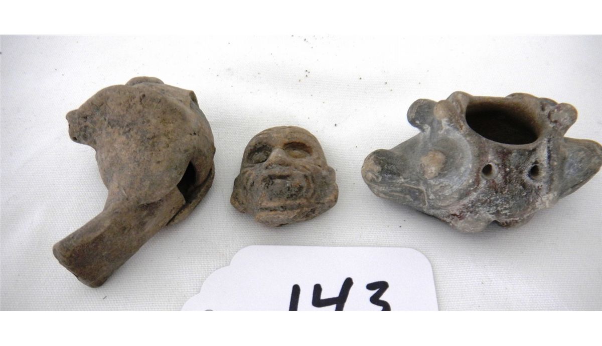 Three Pre-Columbian pieces consisting of whistle, alligator and human head of old person, 1 to 3 inches in size. Condition old, whistle missing head. Shipping $18.00