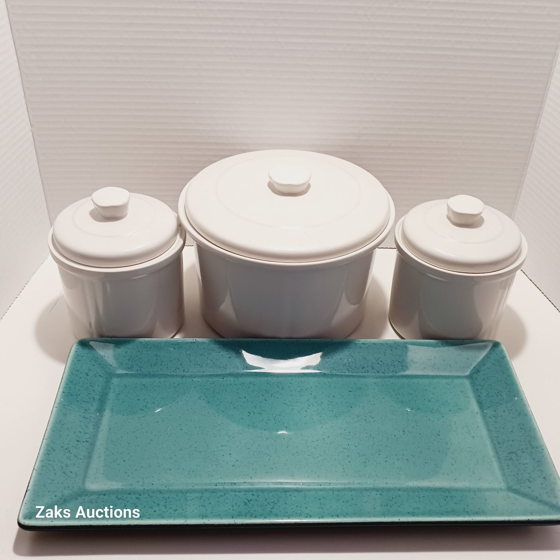 Three Ceramic Stew Pot With Lid & Long Rectangular Dish