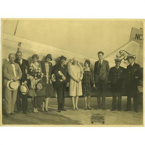 <B>Three Photographs Pertaining to Charles and Anne Lindbergh</B></I> as follows: 14” x 11”, showing Lindbergh amid a crowd of spectators. This candid shot is signed in print on the mat by photographer James J. Meli. Marginal stains and splits, good condition; 14” x 10.5” with mat imprinted by Mission Photographic Service Company, formal group gathered for the Los Angeles arrival of the first Transcontinental Air Transport (TAT) in July, 1929. Among the subjects here are Amelia Earhart, Dorothy Putnam and the Lindbergh's. Very fine condition; 7.5” x 9.25”, Anne Morrow Lindbergh with screen star Mary Pickford. This image was also taken at the TAT event. Very fine condition. <I>From the collection of Cliff Henderson.</B></I><BR><BR><b>Shipping:</b> Flat Material, Small (<a target="_blank" href="http://www.heritageauctions.com/common/shipping.php">view shipping information</a>)