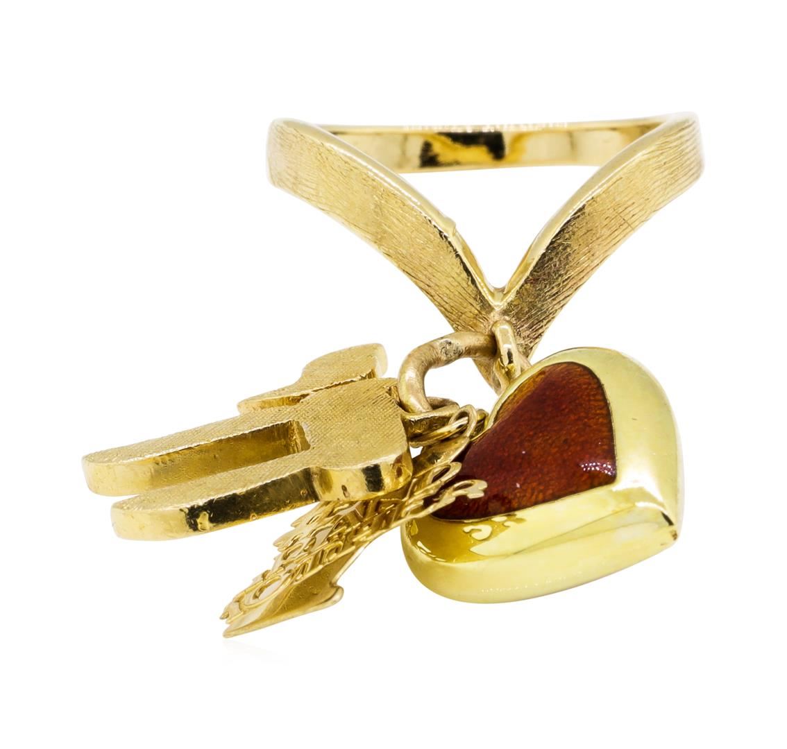 One lady's charm ring featuring: three 14KT yellow gold charms attached to a 14KT yellow gold ring weighing 6.9 grams.