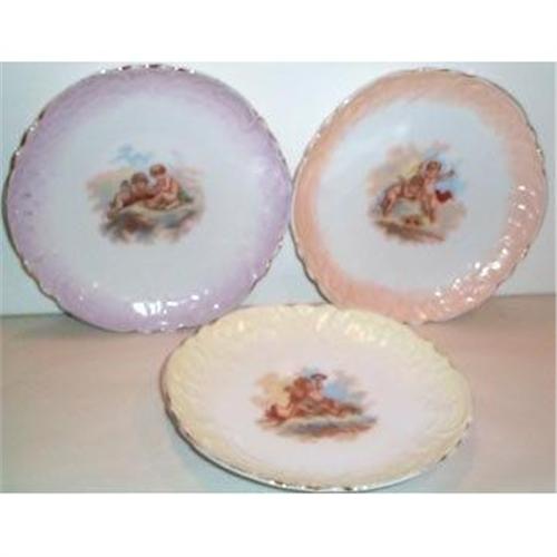 We are offering you three (3) fantastic Cherub Decorated plates all for one money. Each plate has a different background color and each is decorated with a different cherub pattern. They are all three in SUPERIOR condition with no chips, cracks, dings or hairlines and they each measure 7" in diameter and are unmarked on the back but undoubtedly German.