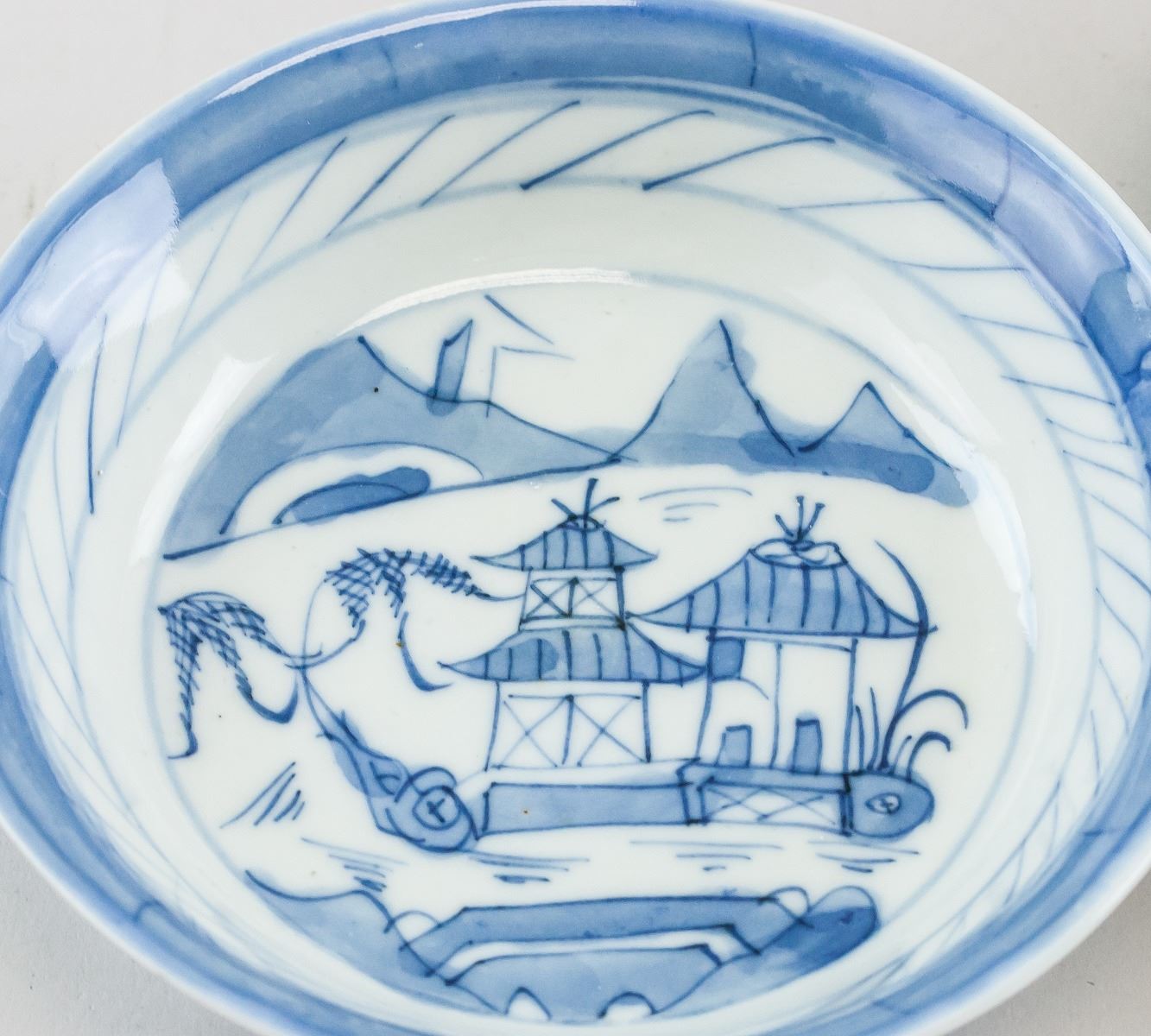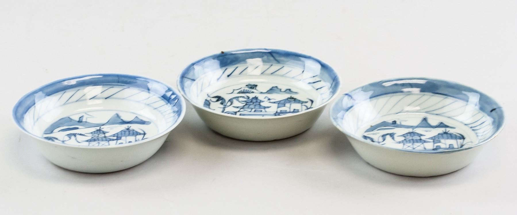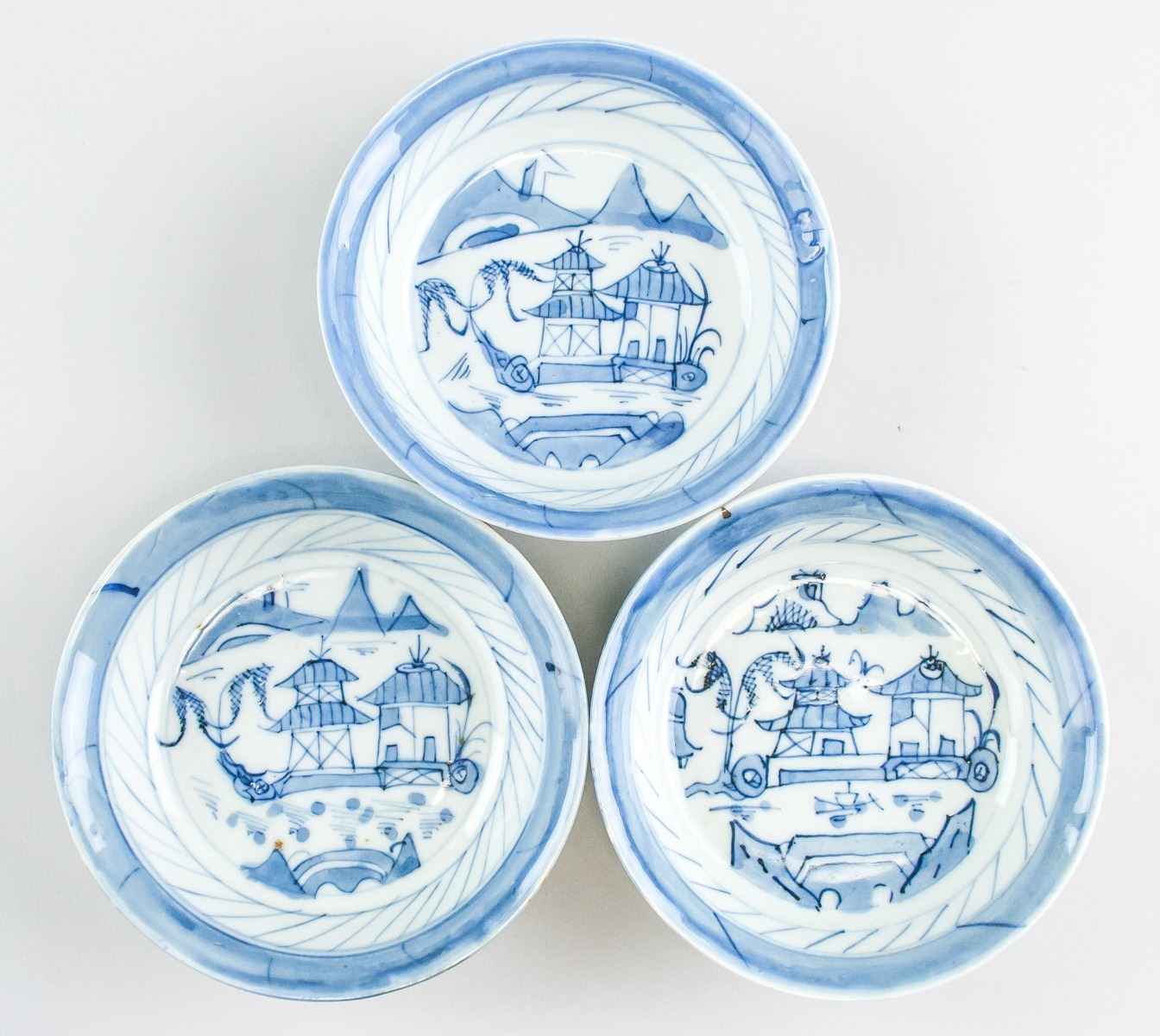 Three (3) Chinese blue and white porcelain plates. Featuring a landscape scene. Unmarked on base. 18th Century. 4 x 13 cm each, 502 grams (total)