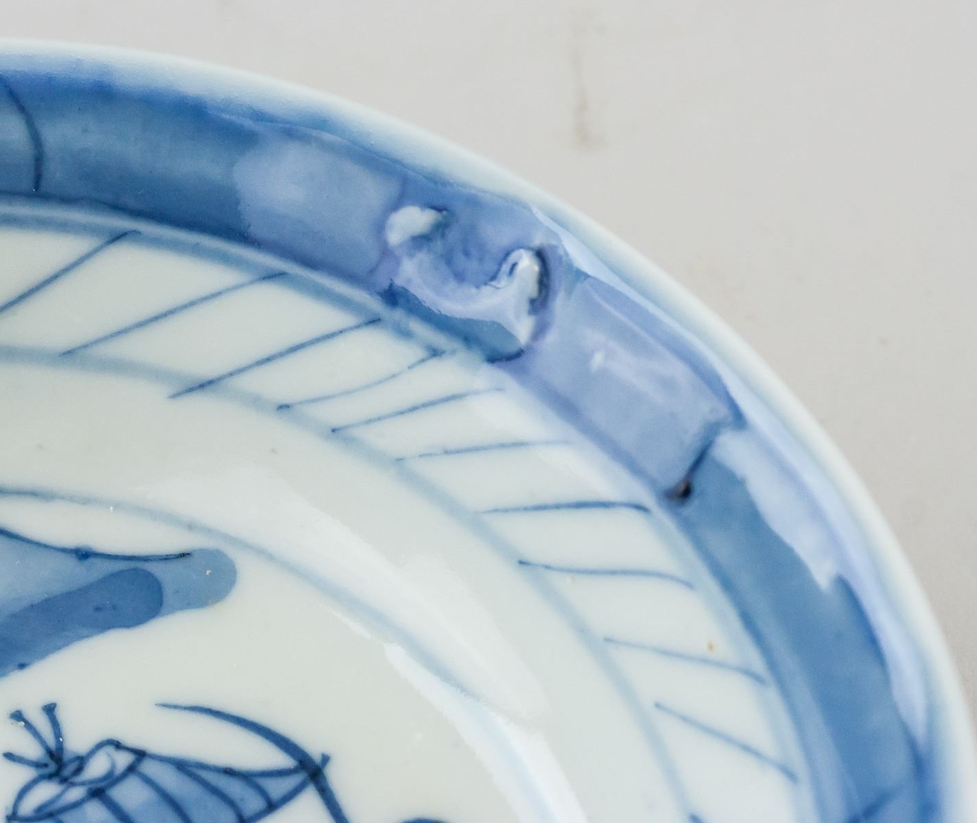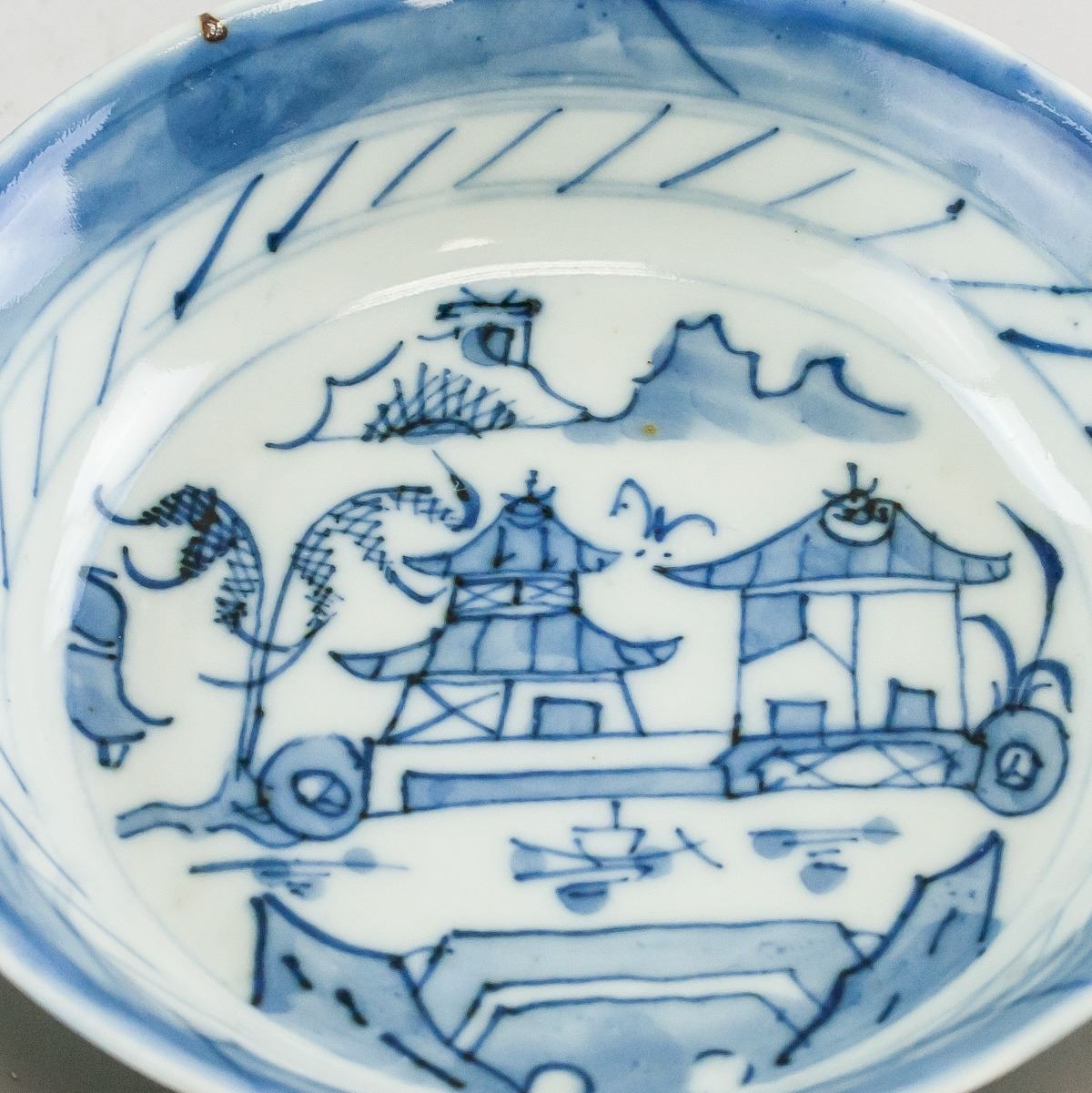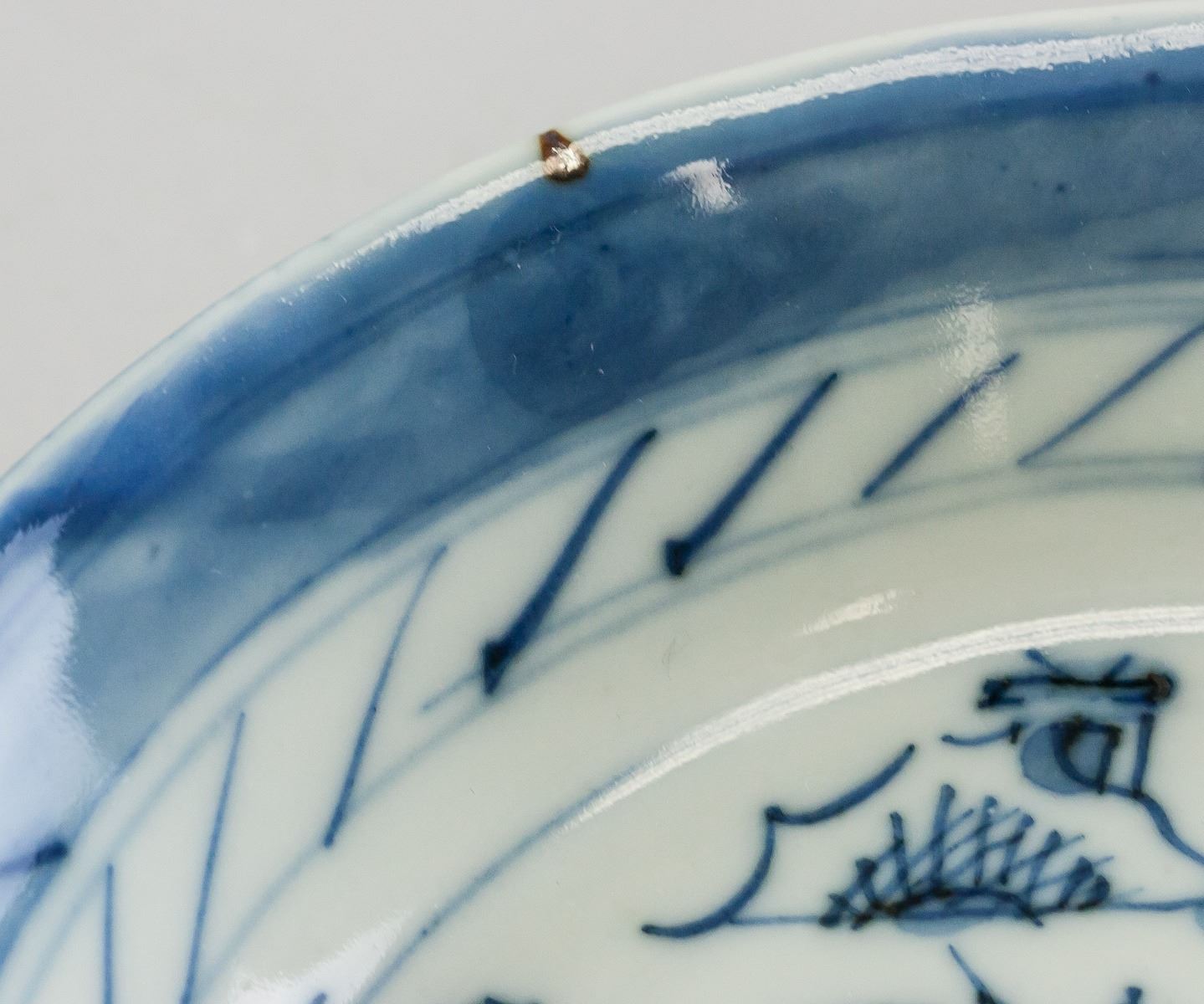 Three (3) Chinese blue and white porcelain plates. Featuring a landscape scene. Unmarked on base. 18th Century. 4 x 13 cm each, 502 grams (total)
