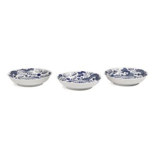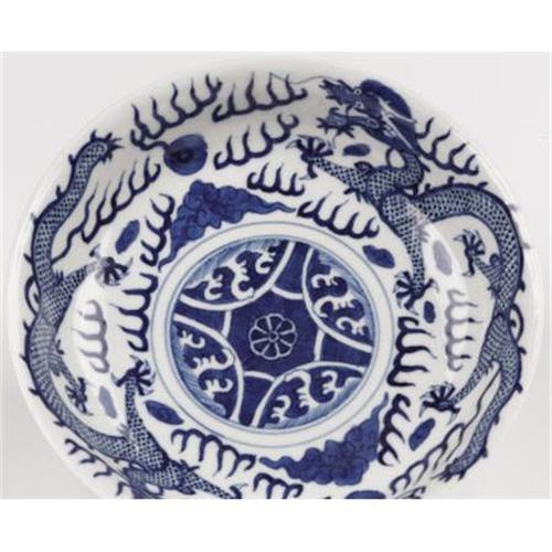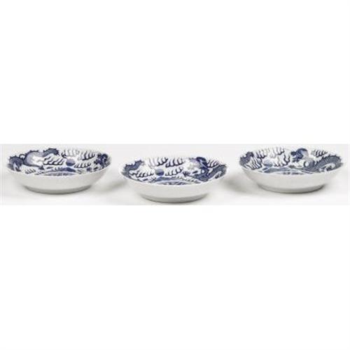<B>Three Chinese Blue and White Porcelain Plates</B></I><BR>Unknown maker<BR>Circa 1800-1875 (Qing Dynasty?)<BR>Three Chinese blue and white porcelain plates, each interior with designs of two writhing dragons amid clouds and flaming pearl(s), centering a lotus design surrounded by clouds<BR>Chop mark to the underside<BR>1.5 inches high x 6 inch diameter<BR><BR><b>Shipping:</b> Requires 3rd Party Shipping (<a target="_blank" href="http://www.heritageauctions.com/common/shipping.php">view shipping information</a>)