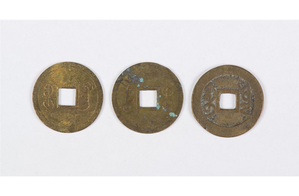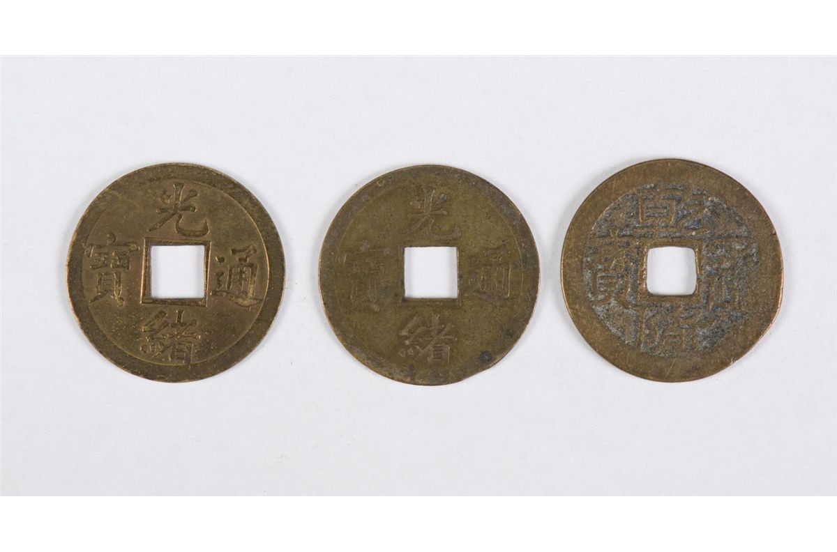 Three pieces of Chinese bronze coins; comprised of two Guang Xu Tong Bao and one Qian Long Tong Bao; D: 2 cm, 10 grams
