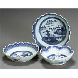 Consisting of two scalloped-edge circular bowls and a foliate-form bowl. Small chips to enamel on rim of each bowl.