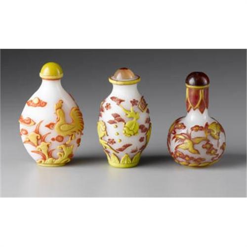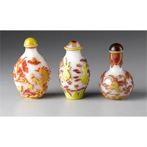 <B>Three Chinese Snuff Bottles<BR></B></I><BR>Three Chinese carved two color overlay glass snuff bottles on white ground; orange and yellow cockrels in a landscape; yellow and red carp amid water foliage, signed; and yellow and red phoenix amid clouds<BR>3in. high<BR><BR> <B>Condition Report:</B> Normal signs of wear as appropriate with age.<BR><BR><b>Shipping:</b> Bottles, Jars & Containers (<a target="_blank" href="http://www.heritageauctions.com/common/shipping.php">view shipping information</a>)