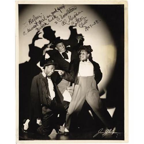 <B>Three Chocolateers Signed Photo.</B></I> A vintage b&w 8" x 10" photo of the vaudeville comedy troupe, inscribed "Helen: A sweet girl and good sport. Much Luck. 3 Chocolateers/Al Gipson/Cotton Club 1937-38" and signed in black ink. In Fine to Very Fine condition with moderate toning, mild edge and corner wear, and some small areas of surface wear.<BR><BR><b>Shipping:</b> Flat Material, Small (<a target="_blank" href="http://www.heritageauctions.com/common/shipping.php">view shipping information</a>)