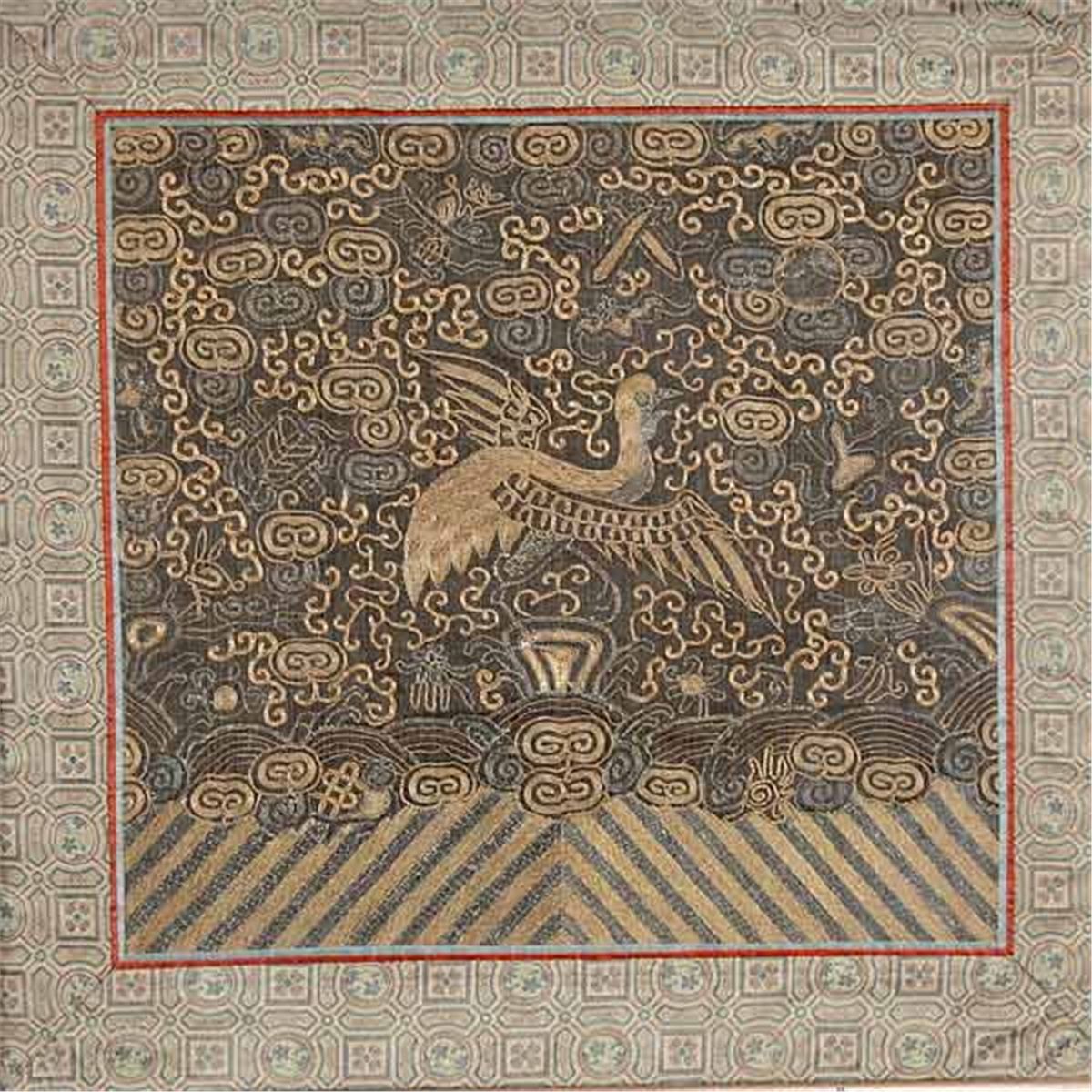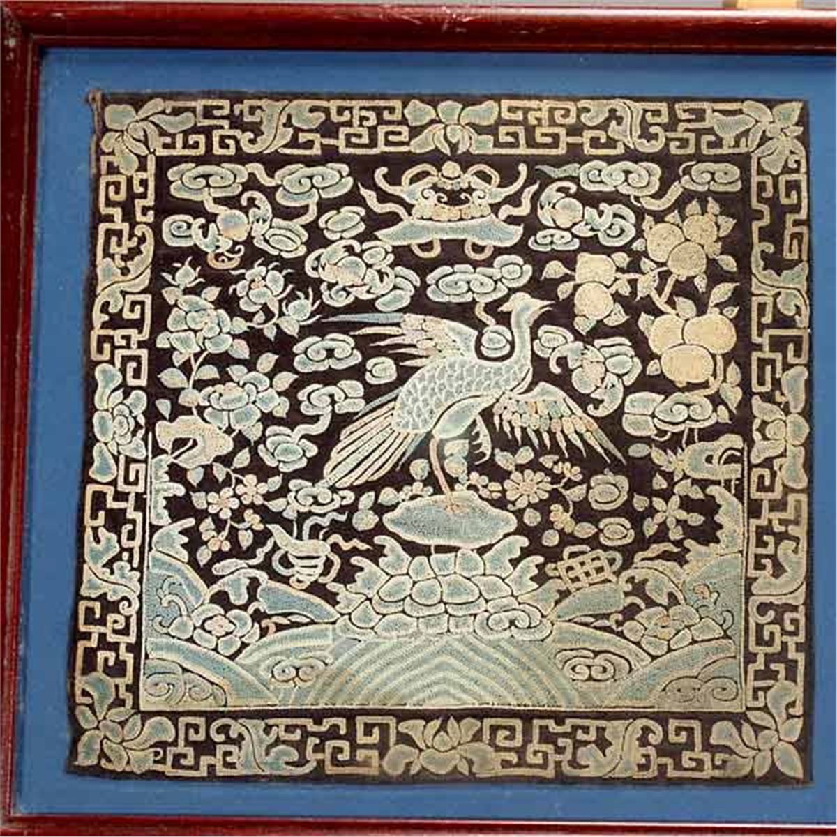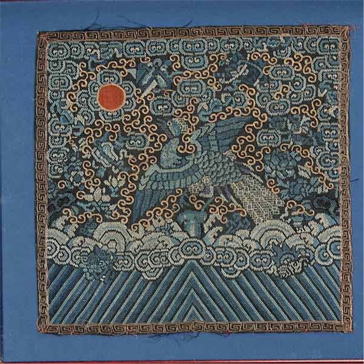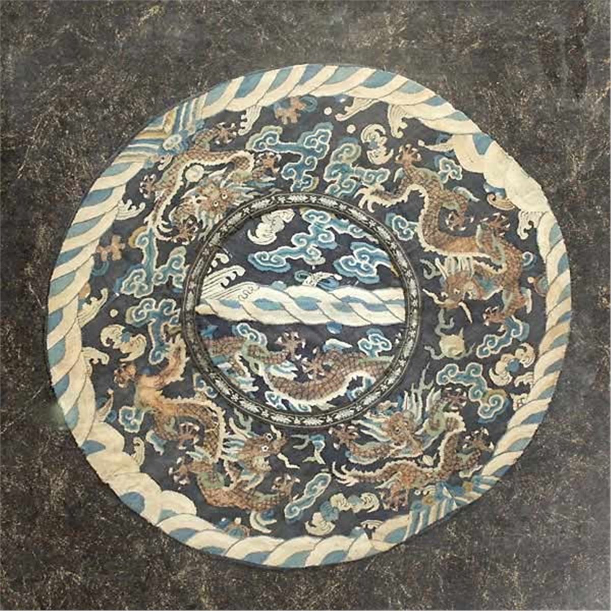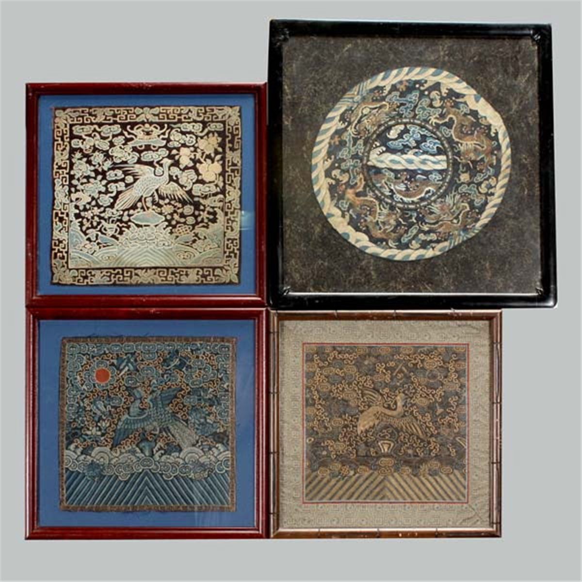 A Group of Three Civil Rank Badges and A Kesi Roundel, The first three embroidered with a central avian form including one of the third civil rank peacock, each shown standing upon rocks between ruyi headed clouds and waves, the various skies scattered with flowers, fruit and scrolling designs; the fourth a circular kesi-woven panel depicting dragons in pursuit of flaming pearls amid clouds and bats, all enclosed within wave form borders. Qing Dynasty, Largest: 13 1/4 x 13 3/4 inches (33.6 x 34.9 cm) [Overall wear to each; some with separations, losses and fraying. This condition report states major condition issues only.]