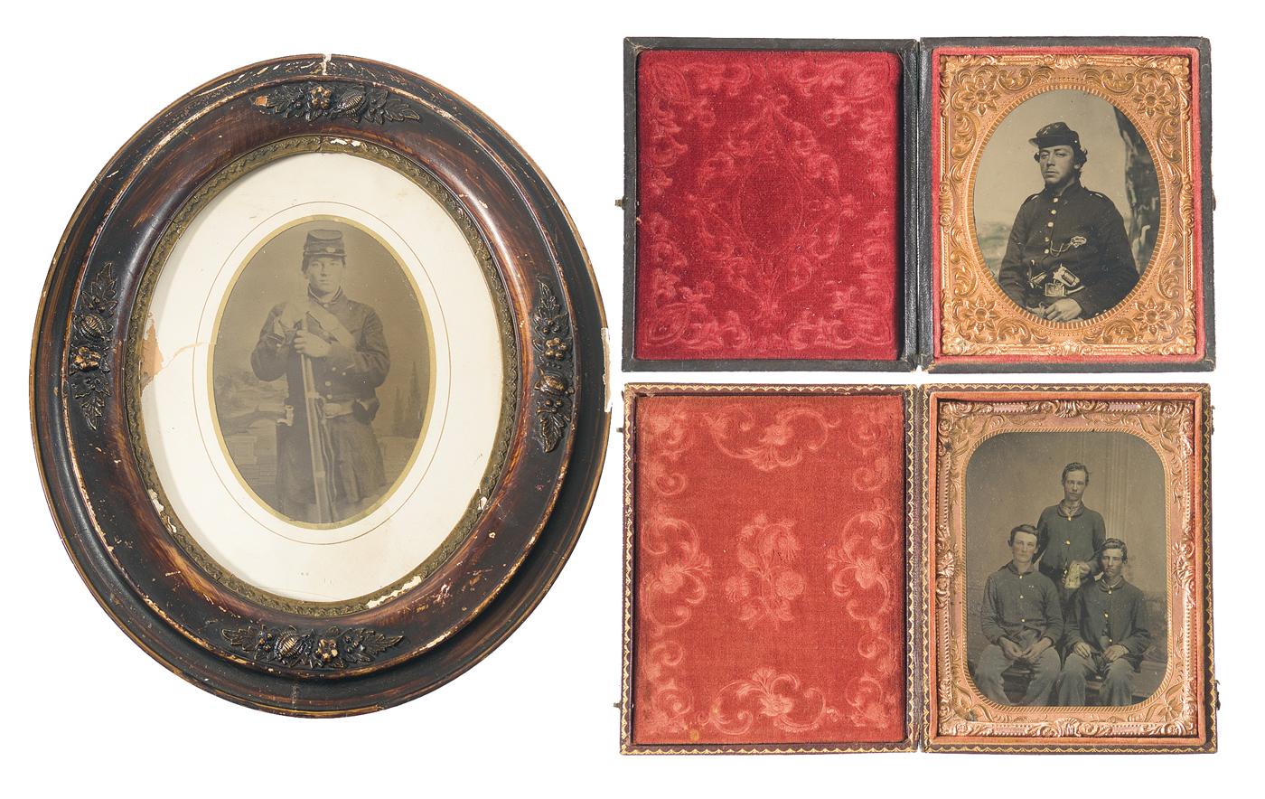 1) Tintype of standing solider with musket. In oval wood frame featuring carved accents with oval matte. The back of the frame has an inscribing stating that the man is Charles Hutchins of Fremont, Indiana, he fought in the Civil War to never return (exact circumstances of his disappearance are unknown). 2) Tintype of solider portrait in paper case with floral motif and maroon lining and filt framing. 3) Tintype of three soldiers in a paper case with floral motif, velvet lining, and filt framing.