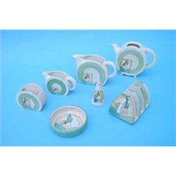Three Clarice Cliff bonjour-shaped milk jugs, a part cruet set, a conical salt, toast rack, teapo...