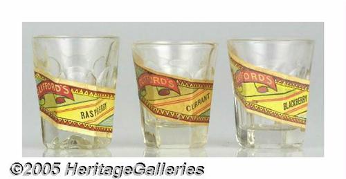 <B>Three Clifford's (Heinz) Sample Jelly Jars With Labels</B></I> Clifford Heinz was one of three children of company founder H. J. Heinz (along with sister Irene and brother Howard). In the 1880s Heinz produced a line of jellies under the Clifford's name brand. Here are three small clear glass sample jars with their seldom seen colorful labels still intact: Blackberry, Raspberry and Currant flavors. The height of these round tapering to hexagonal jars is approximately 2" and the top diameter is 1.5". Excellent condition. Lot:252