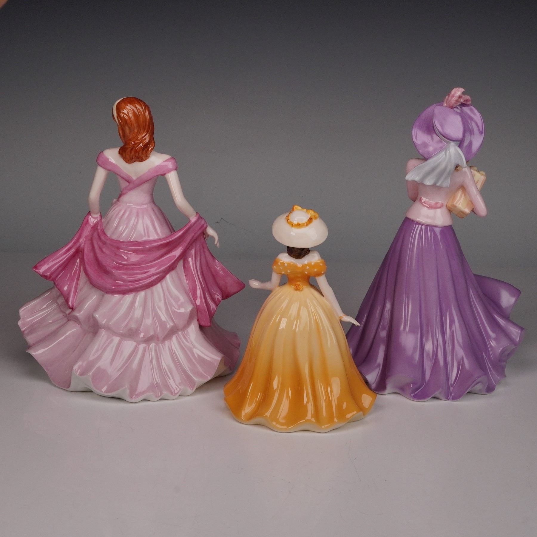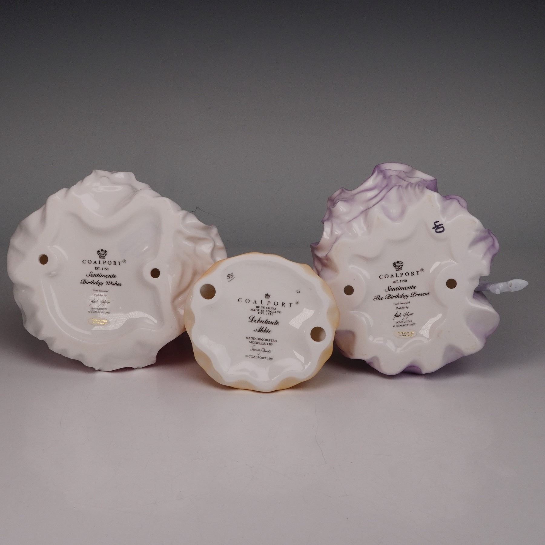 A group of three Coalport bone china figurines, each depicting a lady in an elaborate, romanticized period gown and hat. The figures are rendered in pink, orange, and lavender, displaying fine detail in their drapery and accessories, such as a purse or gift box. The pink figurine is titled "Sentiments Birthday Wishes", the orange "Debutante Abbie", and the lavender "Sentiments The Birthday Present". Their circular bases feature black backstamps reading "COALPORT EST. 1750, MADE IN ENGLAND", alongside their specific titles. All bases are marked with a signature, and dated 1998 and 2005.