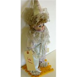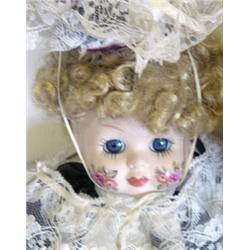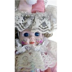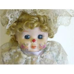 These three clown dolls have porcelain faces, hands and feet. They each have short curly blond hair and dark blue eyes. Beautiful painted flowers decorate their faces. One is dressed in a black and white outfit with a matching hat, one in a peach colored outfit with a matching hat and another in a green and pink colored outfit with a matching hat (she has her own stand). Their outfits are trimmed in lace. They are wearing white felt shoes with ties. They are approximately 16 inches and are in good condition.