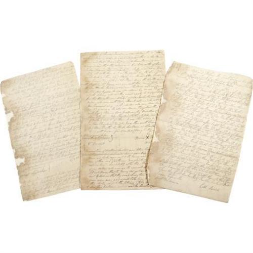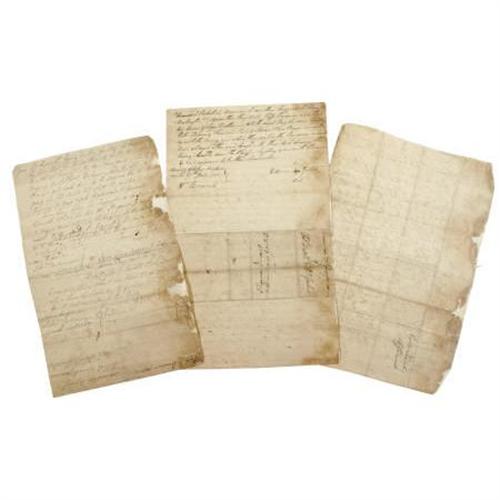 <B>Three Colonial American Legal Deposition Documents.</B></I> Three documents, 8” x 12”, with various 1779 dates, Bergen County, New Jersey. While the subject gist of the three legal examinations are difficult to follow, apparently one deals with the supplying of cattle to the “<I>enemy</B></I>” with references to “<I>Clintons men</B></I>” (British General Henry Clinton). Another deposition deals with a military action involving canoes and the last document concerns the movements of several “<I>black men</B></I>”. The documents are reasonably legible, notwithstanding the contemporary usage of the day, with some loss at the margins of two documents barely affecting text, with the usual fold creases, some soiling, else good condition. <BR><BR><b>Shipping:</b> Flat Material, Small (<a target="_blank" href="http://www.heritageauctions.com/common/shipping.php">view shipping information</a>)