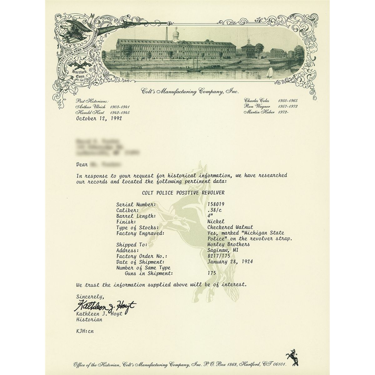 Factory letter states it was shipped on January 28th, 1924. It was also factory engraved on the back strap "Michigan State Police", all features verified.