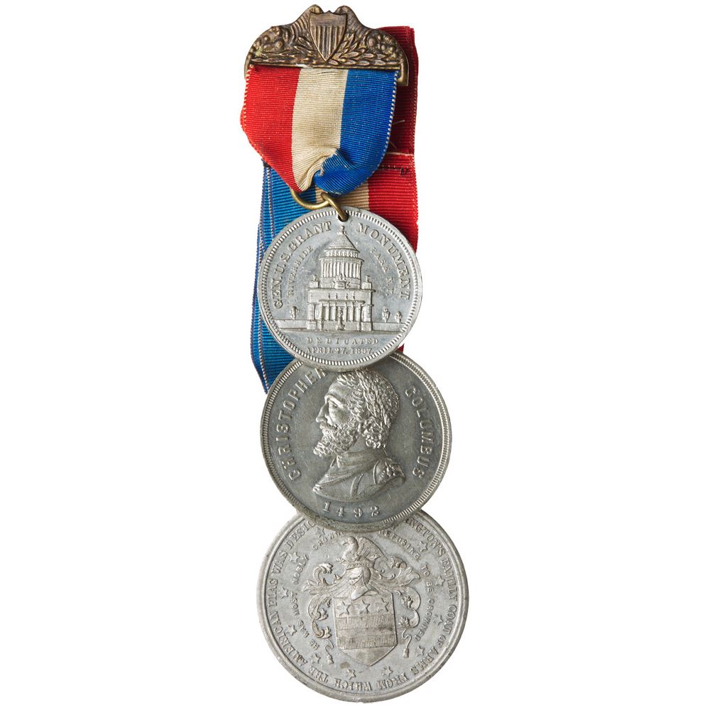 Three Commemorative Medals with Ribbons. Extra-Fine & About Uncirculated. Three very nice medals in an unusual grouping attached by red, white and blue ribbons sewn together. The top medal is U.S. Grant Monument, Riverside Park, New York in white metal. It appears to be a proof and is holed and suspended from decorative brass pin back bar. Below that medal is a 1892 Columbus Bust/Landing Scene medal attributed as HK-236 and Eglit-432 in white metal. It is holed and suspended from a second ribbon that attached to previous medal. The lowest medal is a 1883 Washingtons Headquarters at Newburgh, NY., Proclamation of Peace, Disbandment of Army Centennials medal attributed as HK-135 and Baker-R-456 in white metal. It is holed and suspended for a longer ribbon that is sewn to the other ribbons. All housed in a specimen preservation box. Estimated Value 200 - UP