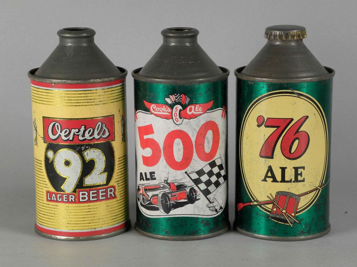 Lot of Three Cone Top Beer Cans including Oertel's 92, Cook's 500 and '76 Ale. Good condition.