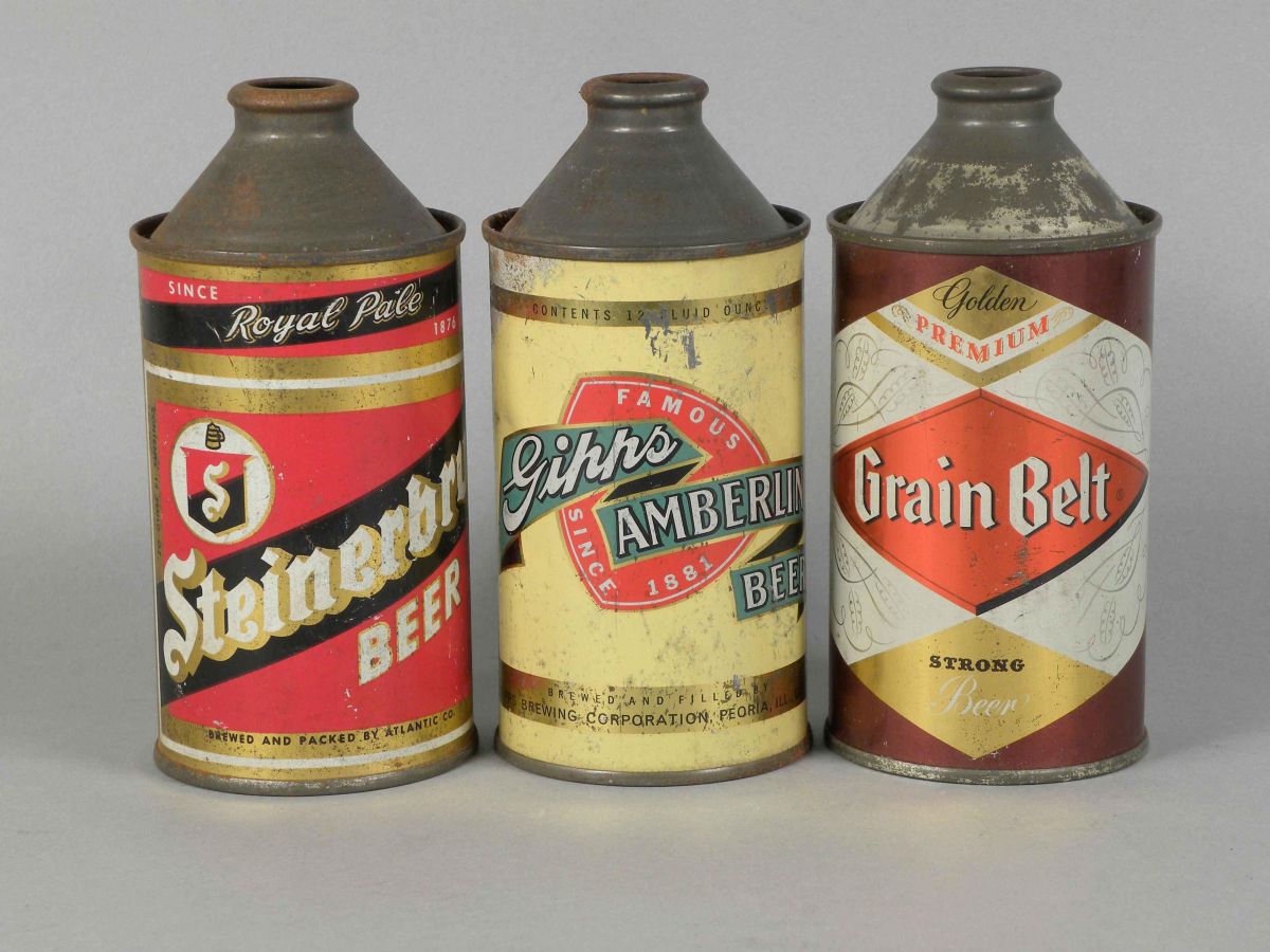 Lot of Three Cone Top Beer Cans including Steiner Bru, Gipps Amberlin and Grain Belt. Fair to good condition.