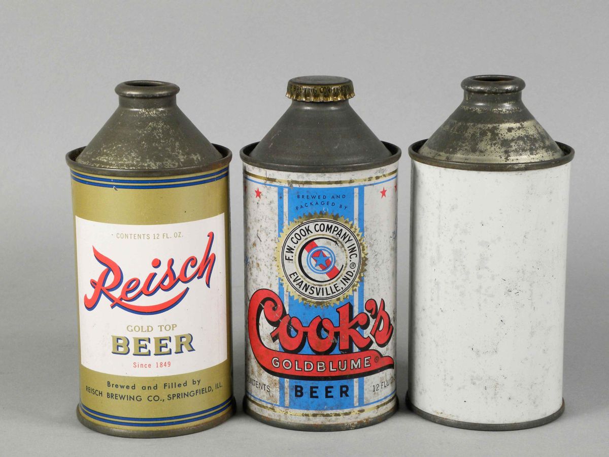 Lot of Three Cone Top Beer Cans including Reisch, Cook's and No Label. Fair to good condition.