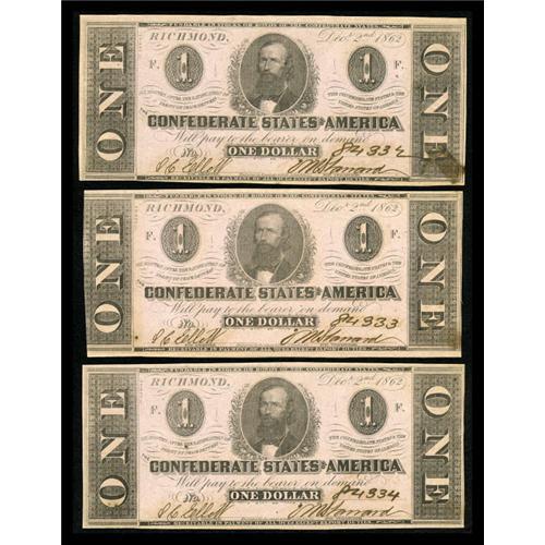 <B>Three Consecutive T-55's. PF-7, Cr. 398.</B></I><BR> All three notes grade <B>Crisp Uncirculated</B></I>. The<B> </B></I>first note has a light ink stain at lower right.<BR><BR><b>Shipping:</b> Coins & Currency (<a target="_blank" href="http://www.heritageauctions.com/common/shipping.php">view shipping information</a>)