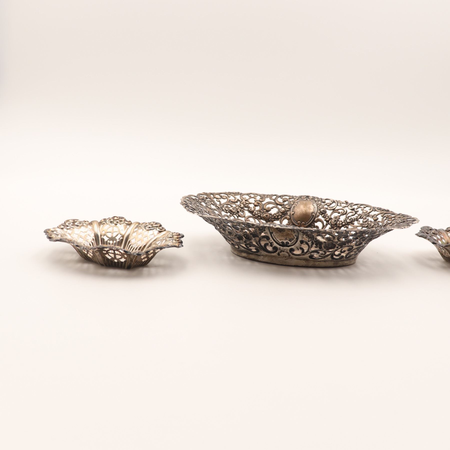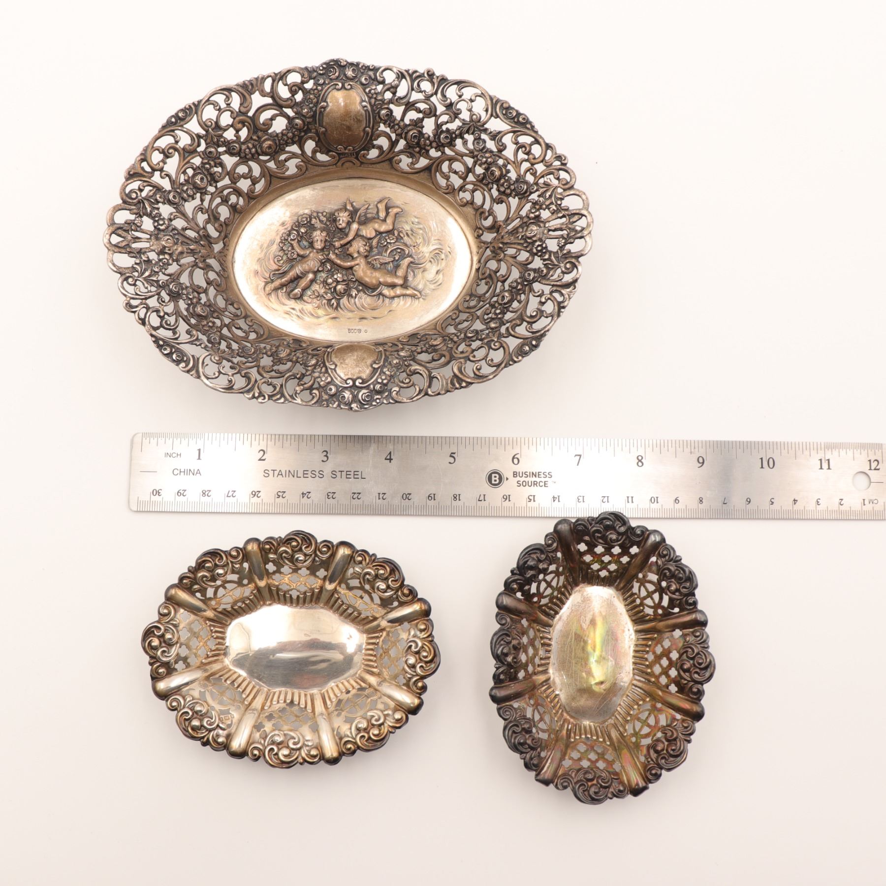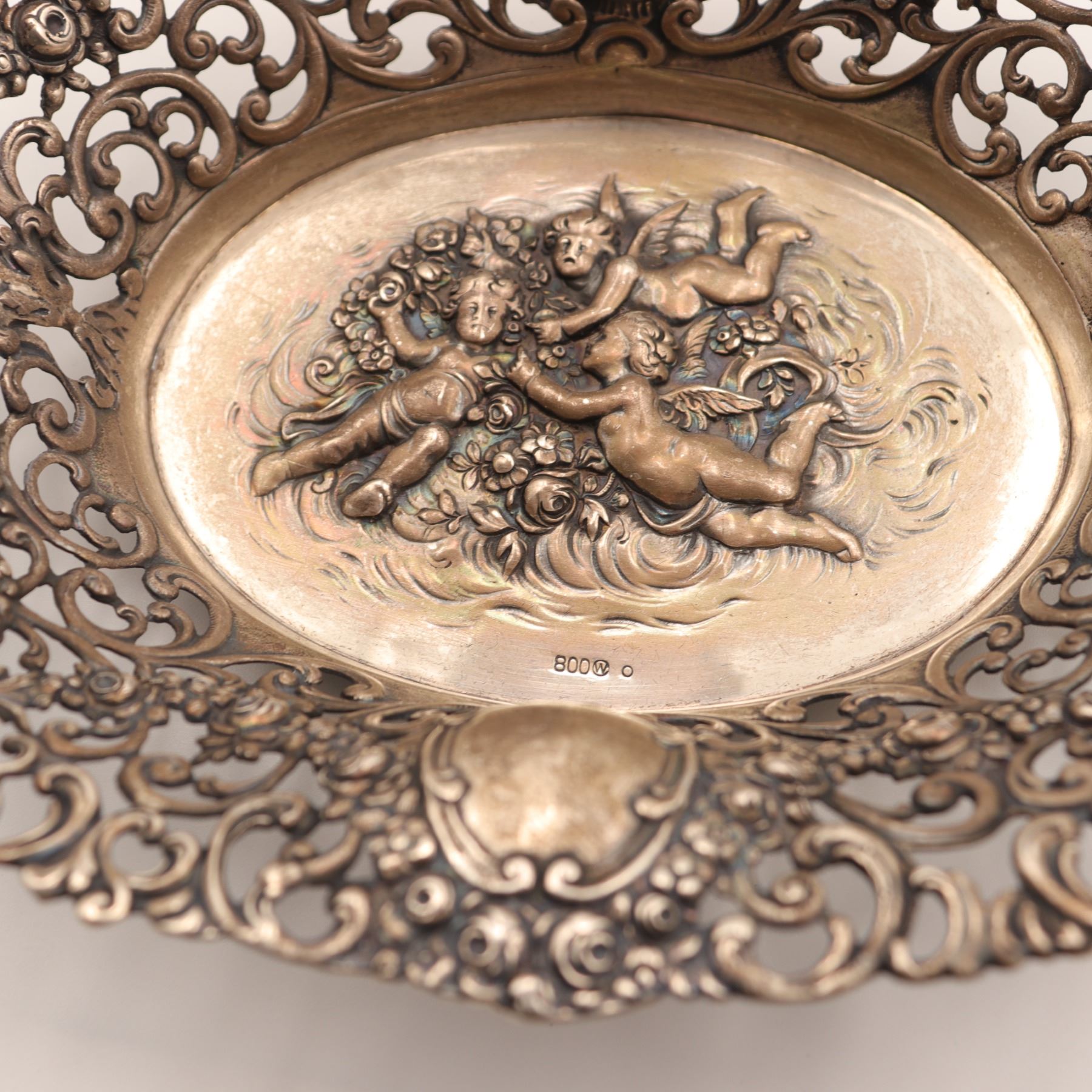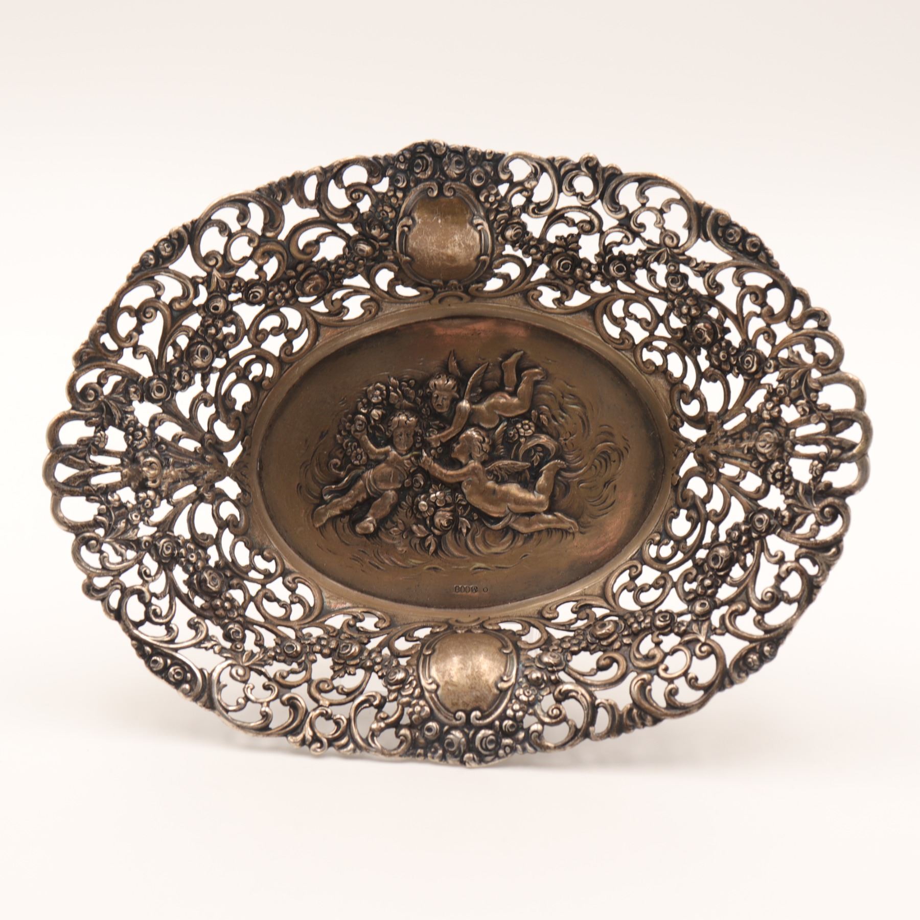 Associated three-piece lot of Continental 800 silver table wares, comprising a larger oval pierced dish with richly cast and pierced Rococo Revival border and central repoussé panel of putti among flowers, together with two smaller oval pierced bonbon dishes of related scrollwork form. All are marked, the principal dish struck 800 and the smaller dishes with additional Continental standard and maker’s punches consistent with German production. Late 19th to early 20th century. A decorative and usable silver group with strong cabinet appeal. Visible with overall tarnish, polishing wear, and light surface scratching from age and handling.