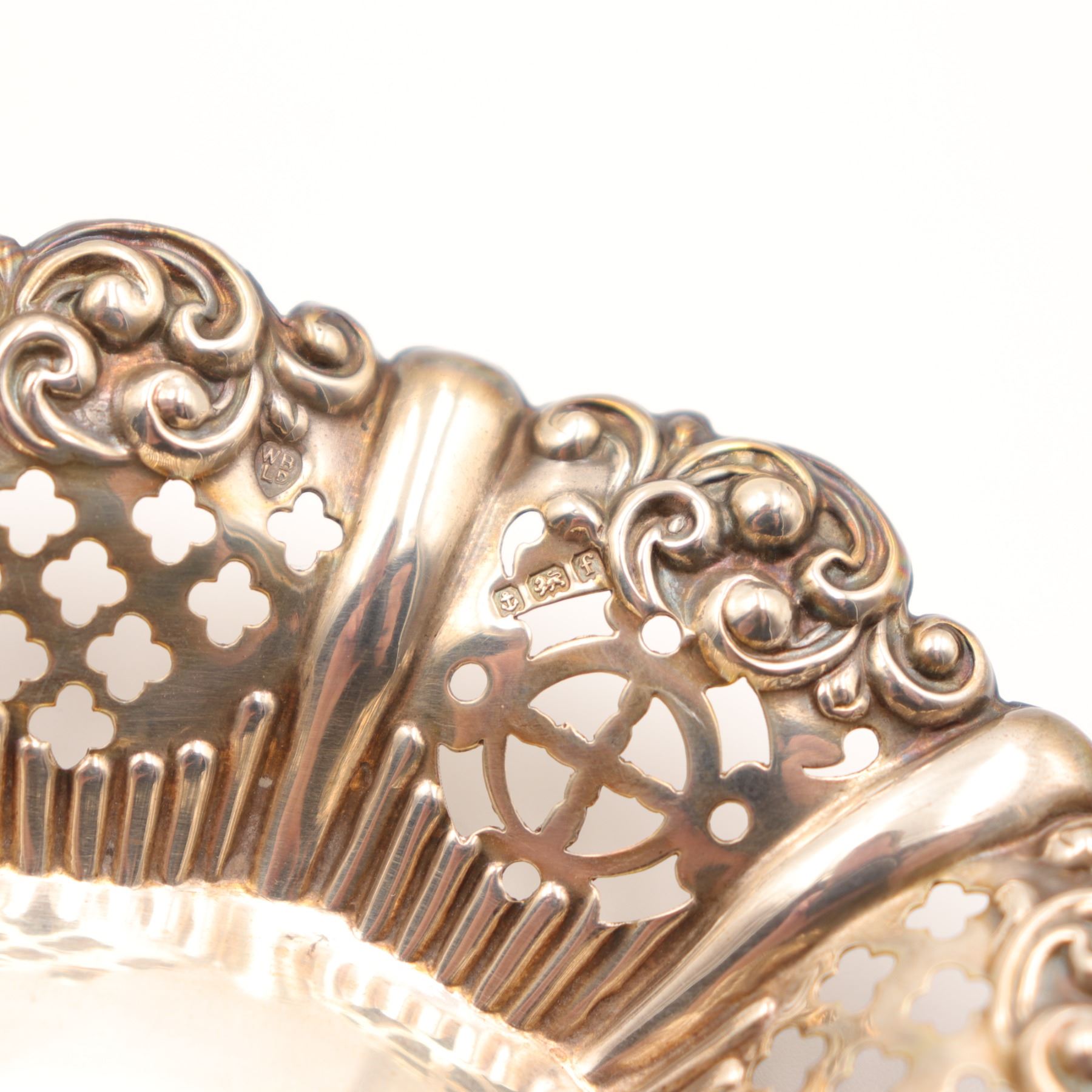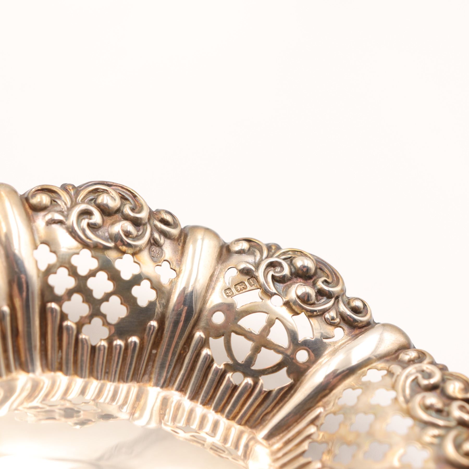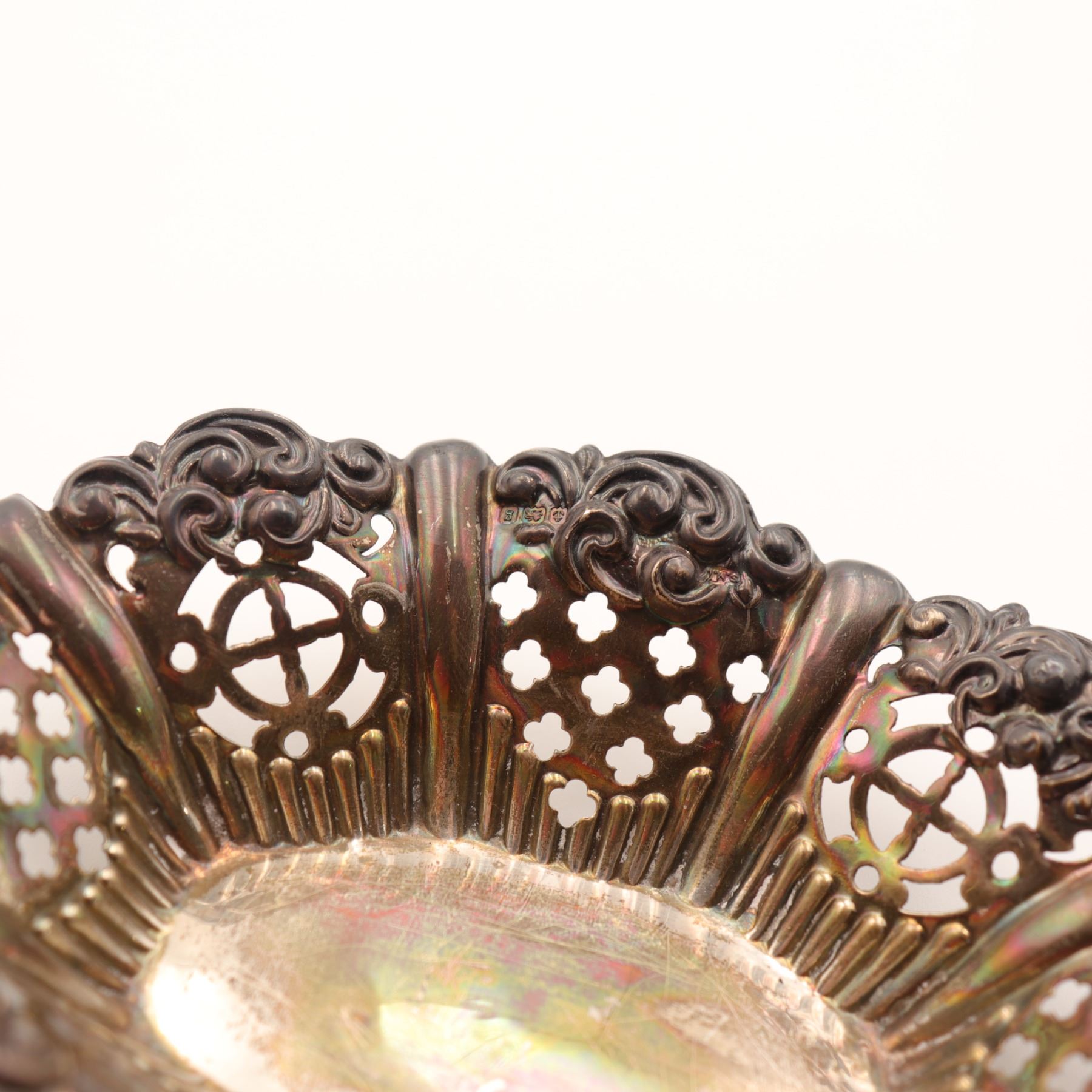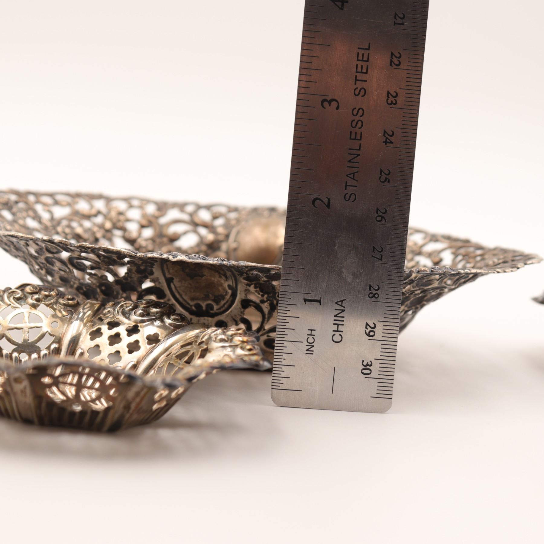 Associated three-piece lot of Continental 800 silver table wares, comprising a larger oval pierced dish with richly cast and pierced Rococo Revival border and central repoussé panel of putti among flowers, together with two smaller oval pierced bonbon dishes of related scrollwork form. All are marked, the principal dish struck 800 and the smaller dishes with additional Continental standard and maker’s punches consistent with German production. Late 19th to early 20th century. A decorative and usable silver group with strong cabinet appeal. Visible with overall tarnish, polishing wear, and light surface scratching from age and handling.