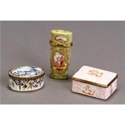 The first a French enamel snuff box in shades of pink and rust, the interior painted with a profile portrait of a young girl; the second a Delft blue and white snuff box highlighted in yellow green and red; the third a German porcelain green-ground etui polychrome decorated with figures in landscapes. The second with underglazed R. mark; the third with underglazed blue crowned monogram mark. The first with cracks and minor losses to enamel; the second with crack to lid and restorations to body.