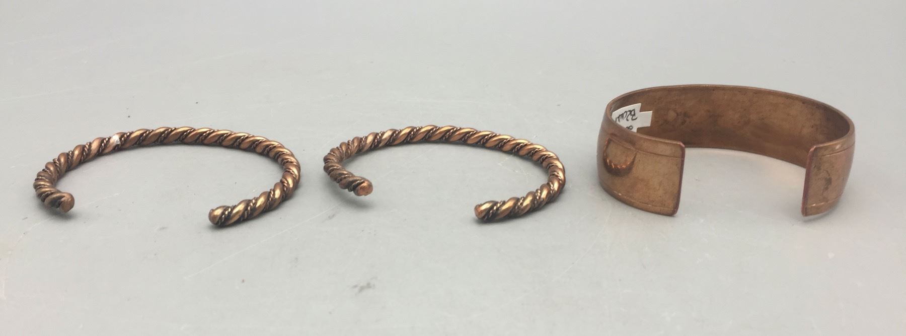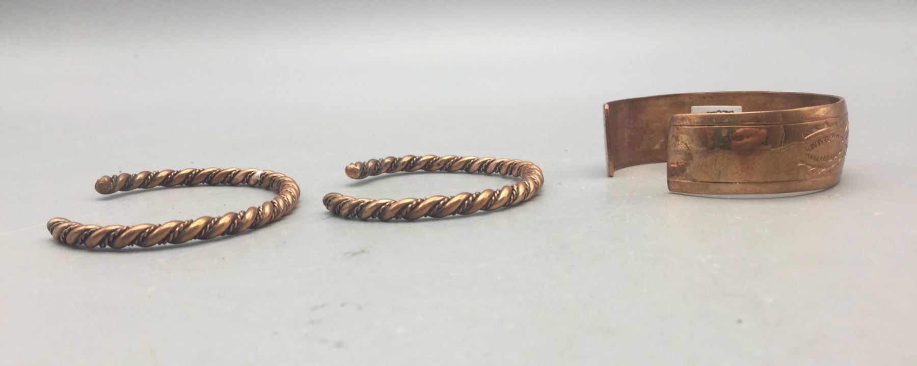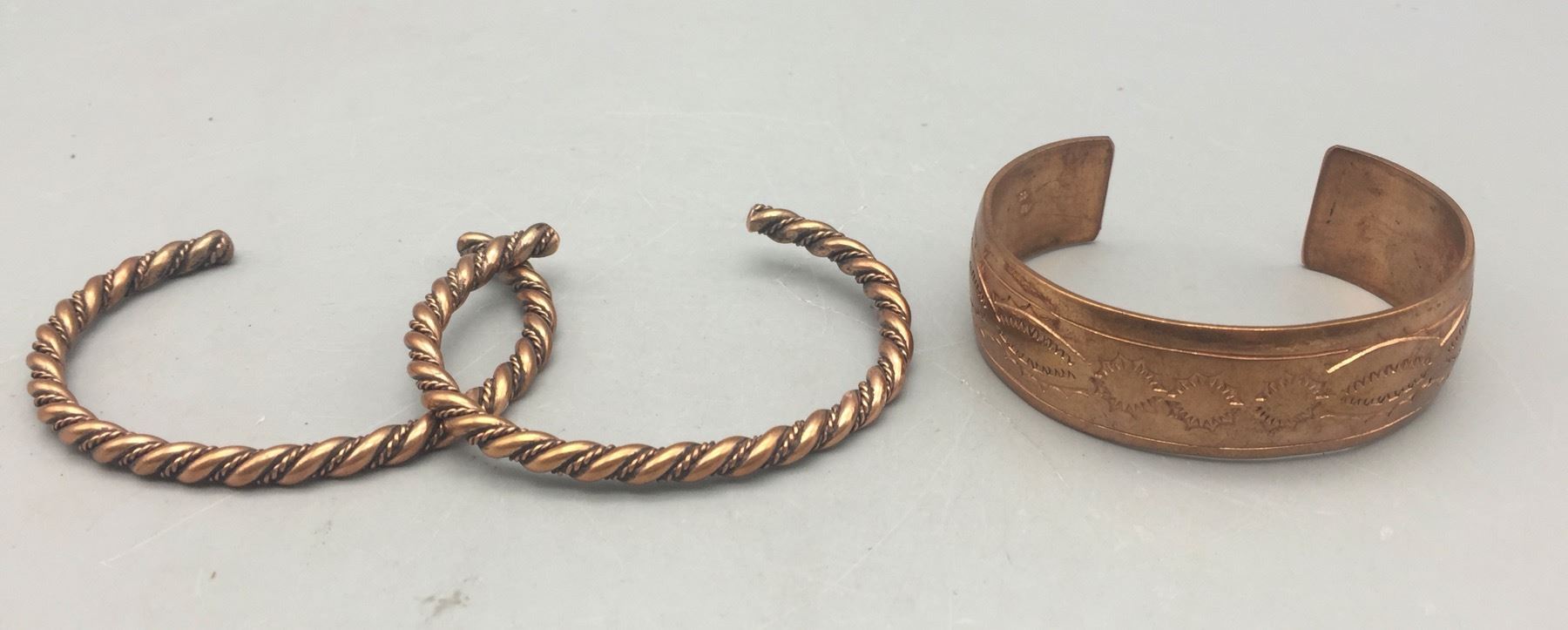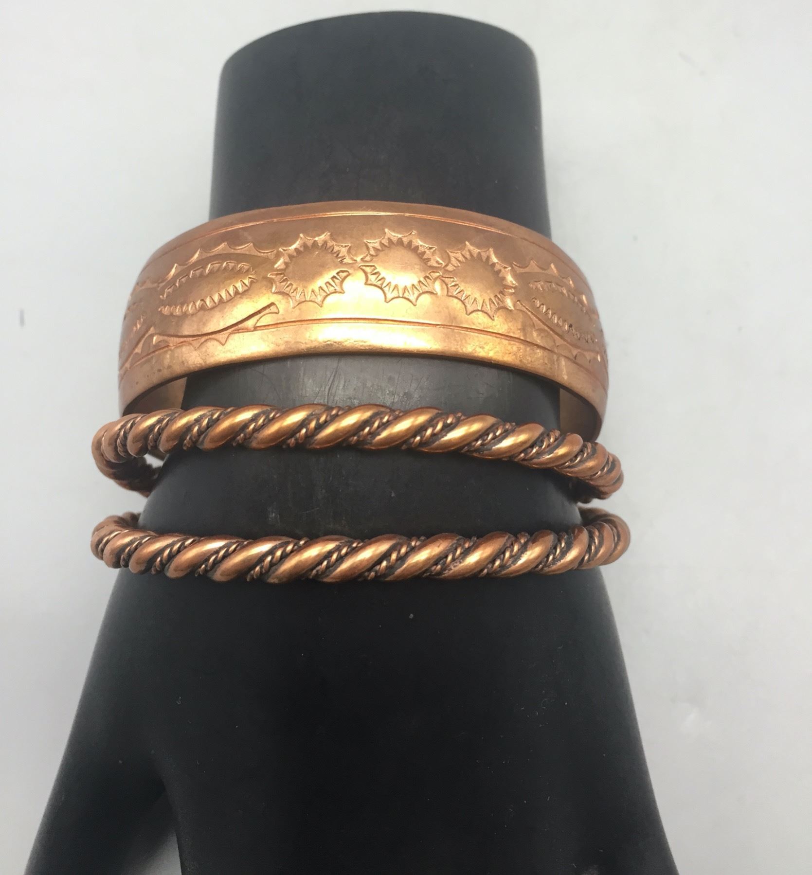 Description: For sale in this lot we have three copper bracelets which would be great for stacking! Maker: Stanley Brown, Navajo. Approx. Age: New. Size: Various. Combined weight is 68.3 grams. Condition: Good. Please look closely at the pictures - they are an important part of our description. Shipping: There will be a $5 handling / packaging fee for shipping this lot. The actual cost of postage will be added on top of that.