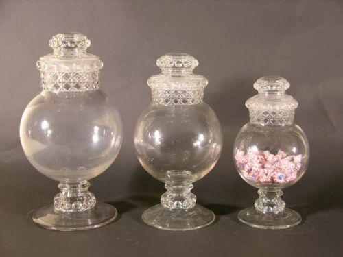 Three Dakota candy jars with ground stoppers. Sizes are 15", 13", and 11". ex. Cond., no chips or cracks.