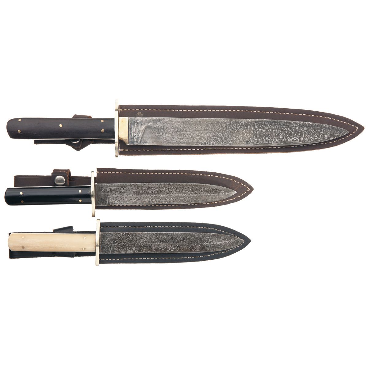 All are marked "NORFOLK St/ SHEFFIELD/ ENGLAND", with asterisk and cross stamps on the reverse, German silver guards, smooth grips and leather sheaths. 1) 10 1/2" blade, scalloped guard, rosewood grips. 2) 6 1/2" blade, oval guard, ebony grips. 3) As 2, bone grips. All are very good to excellent as unfinished.