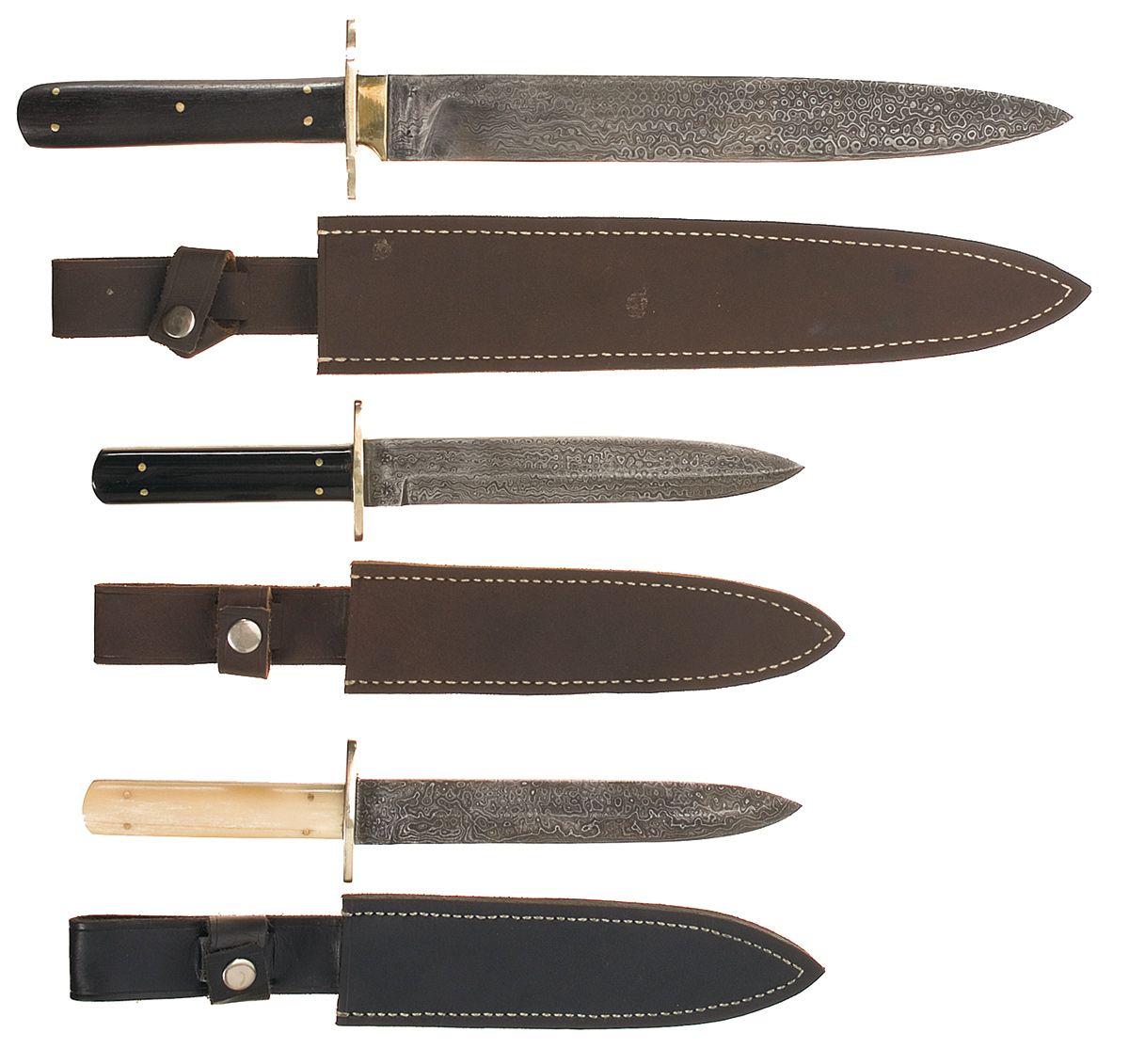 All three are addressed "NORFOLK St/ SHEFFIELD/ ENGLAND", with asterisk and cross stamps on the reverse, with German silver guards and leather sheaths. 1) 10 1/2" blade, with scalloped guard and smooth rosewood grips. 2) 6 1/2" blade, oval guard, and smooth ebony grips. 3) As 2, with polished bone grips. All are very good to excellent as unsharpened.