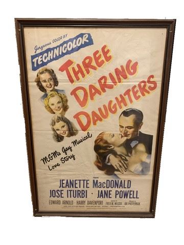 "Three Daring Daughters"(1948), MGM Films, starring Jeanette MacDonald, Jose Iturbi and Jane Powell, signed, original movie poster. Jane Powell signed the poster: "Baby Debs, Love Ya". Poster has been protected by the frame for many years as this hung on the walls of the Debbie Reynolds Dance Studio. Litho numbered 48/740.