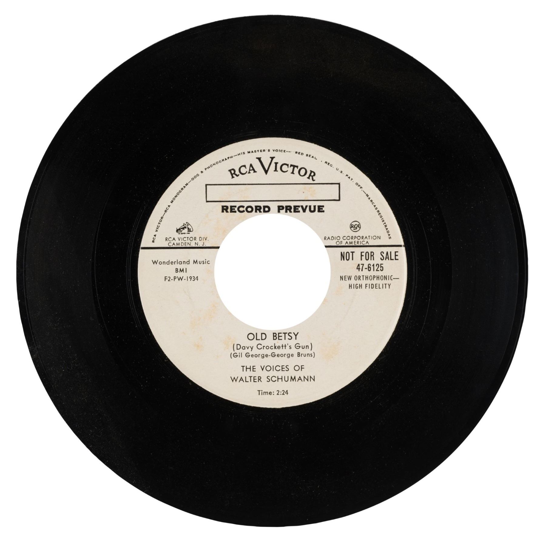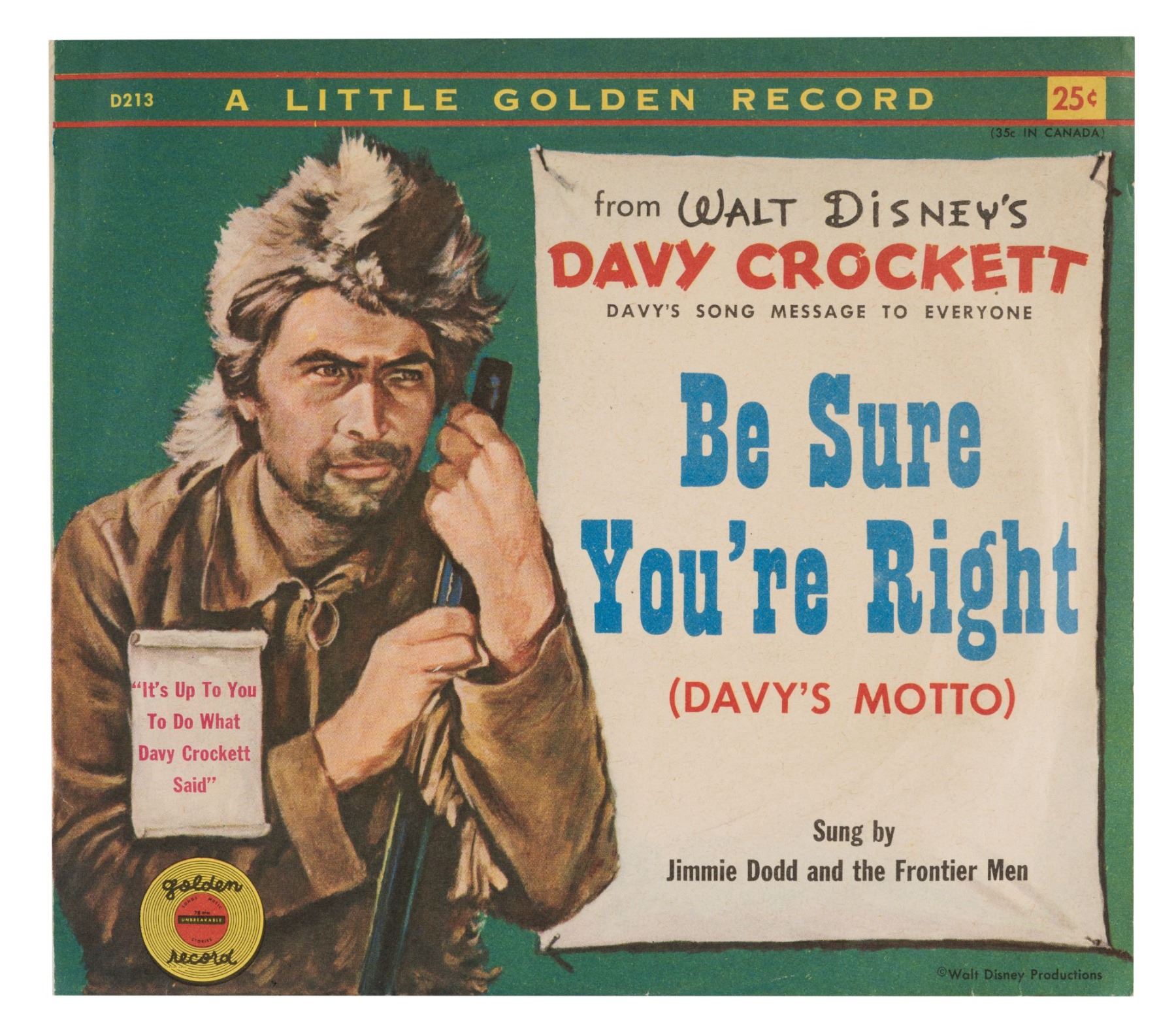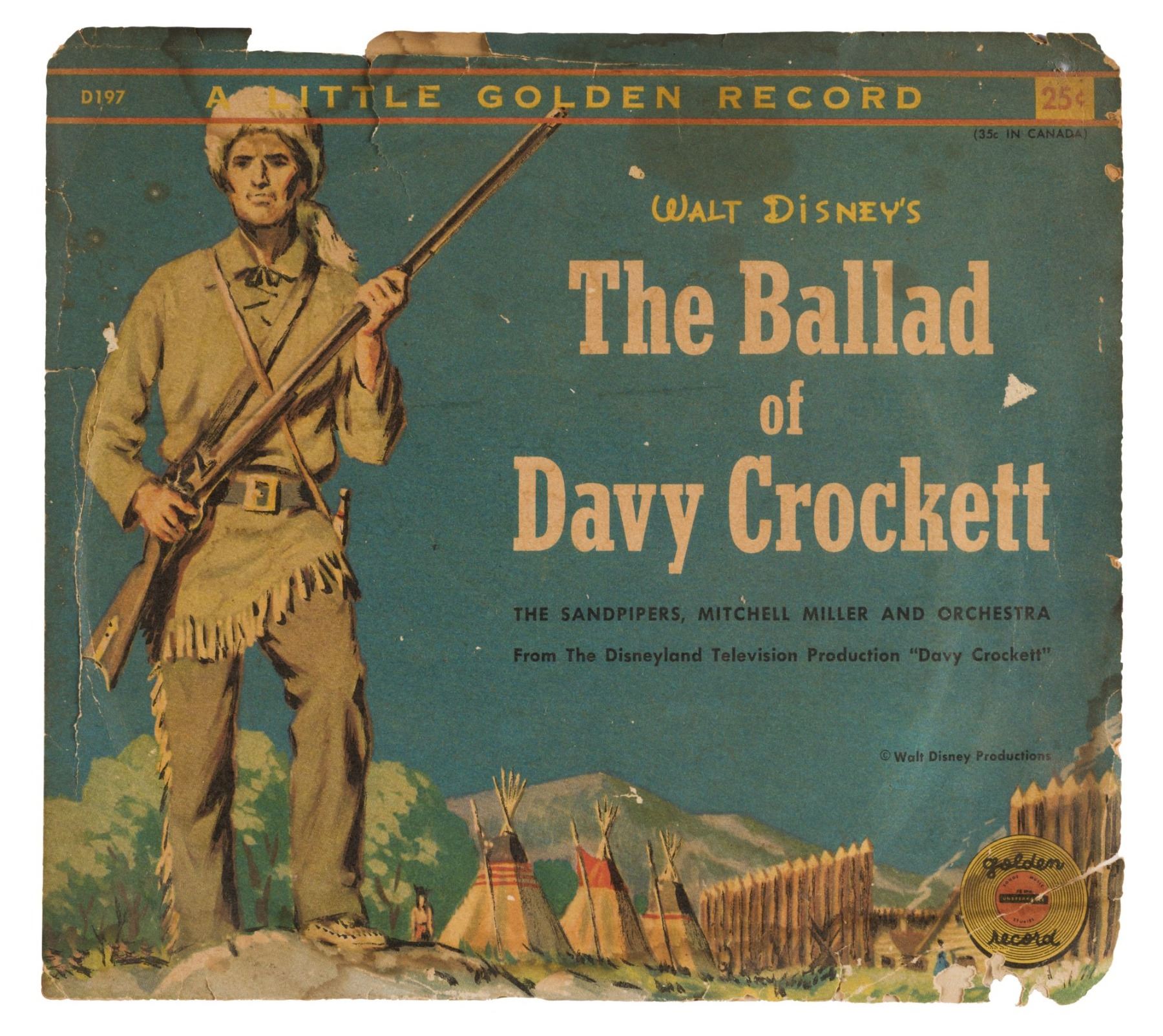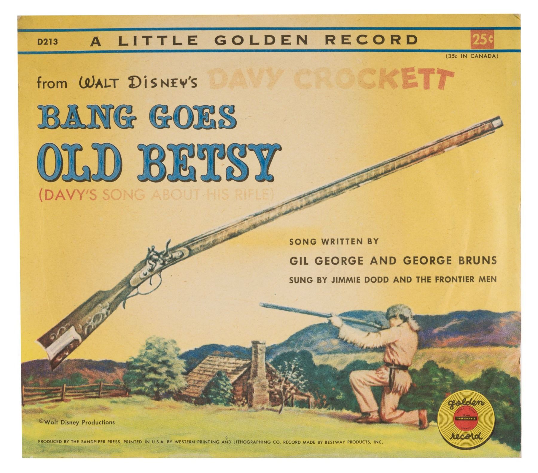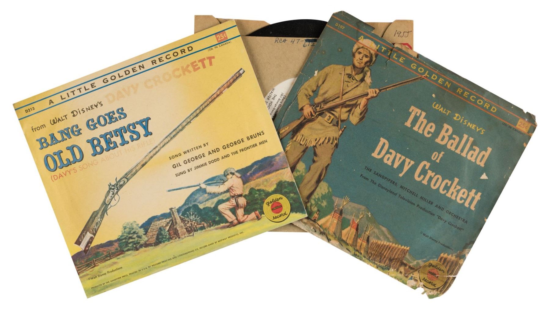 (RCA/Golden, 1950s) A trio of Davy Crockett records by RCA and Golden Record. Included are two Little Golden Records featuring “The Ballad of Davy Crockett,” “Bang Goes Old Betsy,” and “Be Sure You’re Right,” and one RCA Recording of “Old Betsy” and “Shoeless Joe From Hannibal, M.O.” Measuring 6.75” and 6”, the records are in good working condition with a loose record label, mild scratches, and much wear and tear to the album jackets.