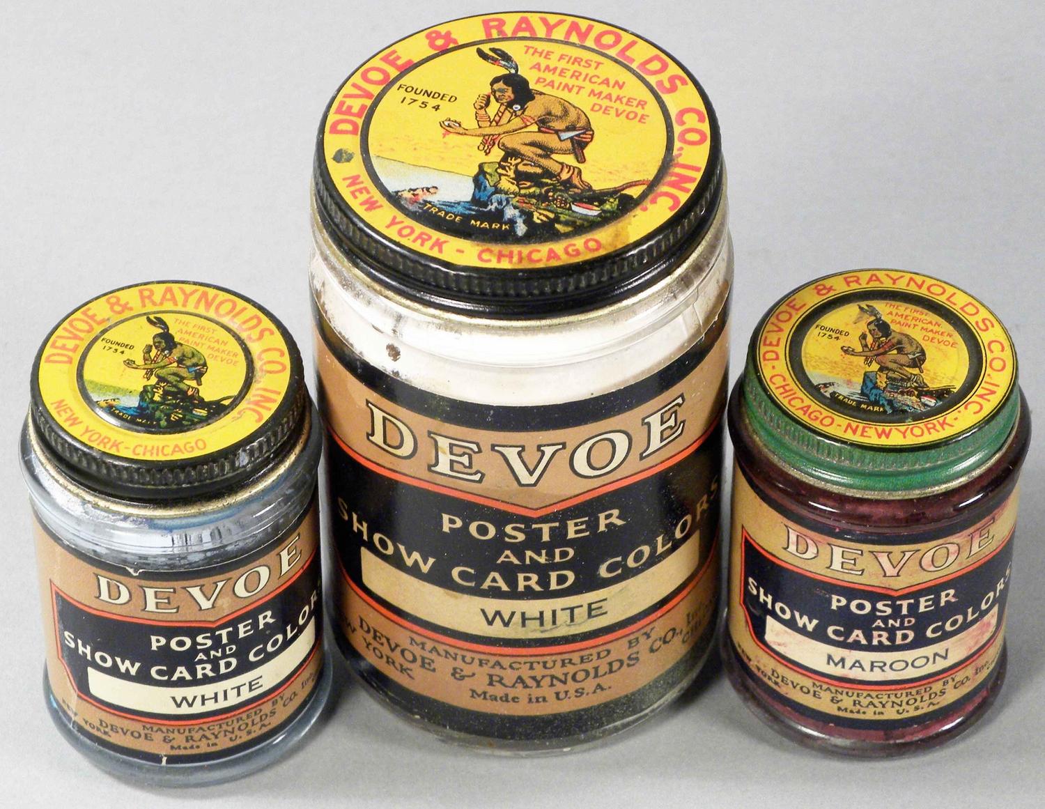 Devoe & Raynolds Co. Paint Jars. Each has original tin litho lid and paper labels. All in excellent condition with minor paper loss to maroon label. Large jar is 8 oz and measures 4 1/4 inches tall. Starting bid $40