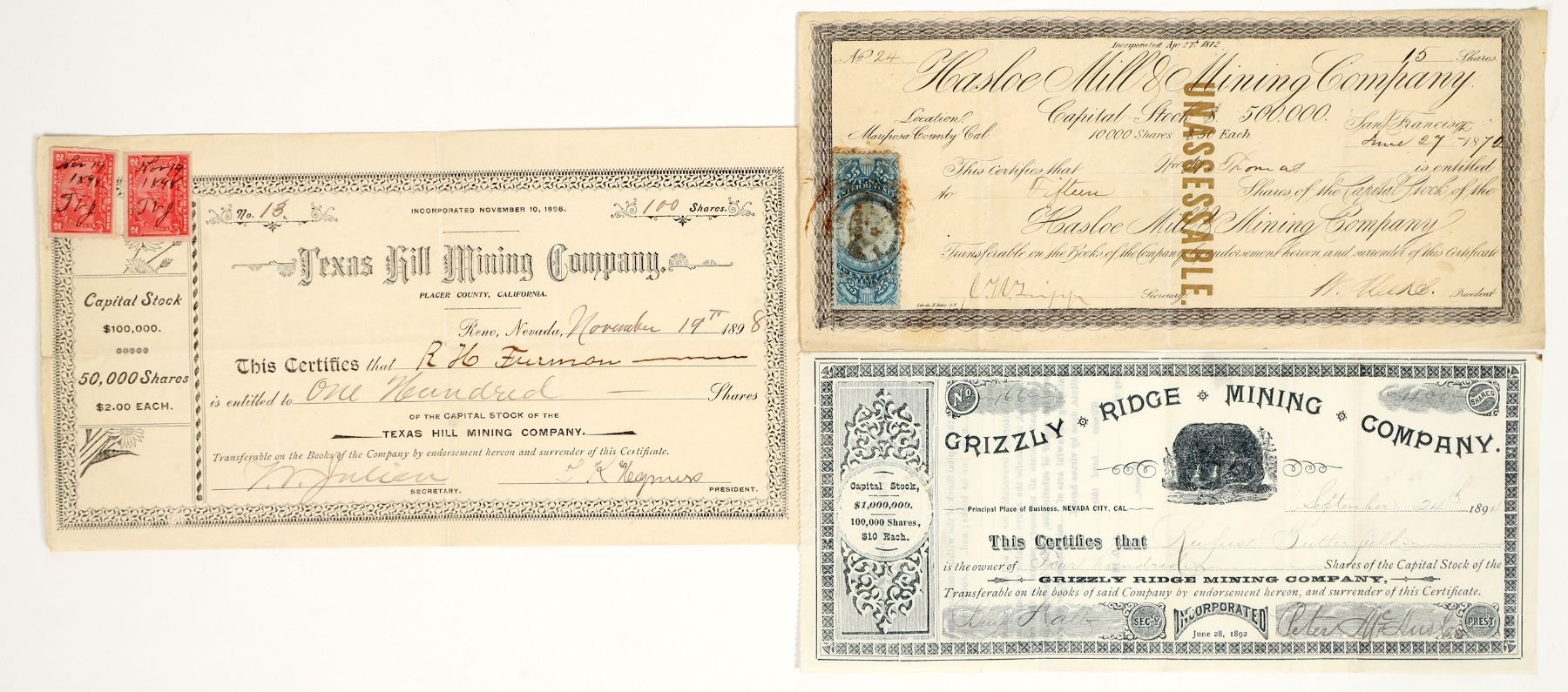 Lot of 3 different. 1) Washoe Mill & Mining Company. Location Mariposa County, Cal. (printed on left). Issued in 1872 for 15 shares to William Thomas. Signed by the president and secretary. Not cancelled. 2) Grizzly Ridge Mining Company. Nevada City, Issued in 1894 for 400 shares. Not cancelled. Grizzly bear vignette. The Grizzly Ridge mine was located on Grizzly Ridge near Columbia Hill, Nevada County. It was a hydraulic mine from 1886 until 1894, then in 1916 it was reopened as a drift mine 3) Texas Hill Mining Company. Placer County, California. Issued in Reno, Nevada in 1898. Not cancelled. The Texas Hill mine is some 2.5 miles east-southeast of Placerville, Placer County.