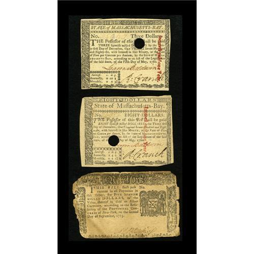 <B>Three Different Colonials.</B></I><BR>New York September 2, 1775. $5 <B>Very Good,</B></I> Edge Splits.<BR>Massachusetts May 5, 1780 $3 <B>New,</B></I> HC.<BR>Massachusetts May 5, 1780 $8 <B>New,</B></I> HC.