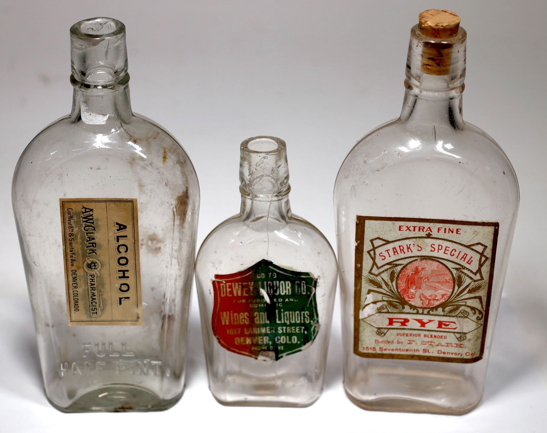 Lot of 3 different coffin or shoo fly paper label flasks. 1) Stark's Special Rye, Bottled by P. Stark. Colorful pictorial label with piece missing. Bottle is 7.25", half pint, with bubbles, a few scratches, and cork. 2) Alcohol half pint flask for A.W. Clark, Pharmacist. Label has soiling. Bottle is 7.25", stains, bubbles. 3) Dewey Liquor Company. Shield shaped label with stains, rips. Bottle is 5". Please inspect.