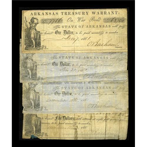 <B>Three Different Little Rock, AR- Treasury Warrants</B></I><BR>$1 Dec. 7, 1861 Cr. 1b, a nice looking piece signed by O. Basham. The center bend is a bit heavy and causing some minor splits <B>Very Fine</B></I>;<BR>$1 Dec. 21, 1861 Cr. 1c, solid paper for a <B>Very Fine</B></I>;<BR>$1 Dec. 12, 1861 Cr. 4, <B>Very Fine</B></I> with a couple of edge aberrations;<BR>$5 Dec. 12, 1861 Cr. 4c, <B>Very Fine</B></I> with a reinforced back.<BR><BR><b>Shipping:</b> Coin/Currency (<a target="_blank" href="http://www.heritageauctions.com/common/shipping.php">view shipping information</a>)