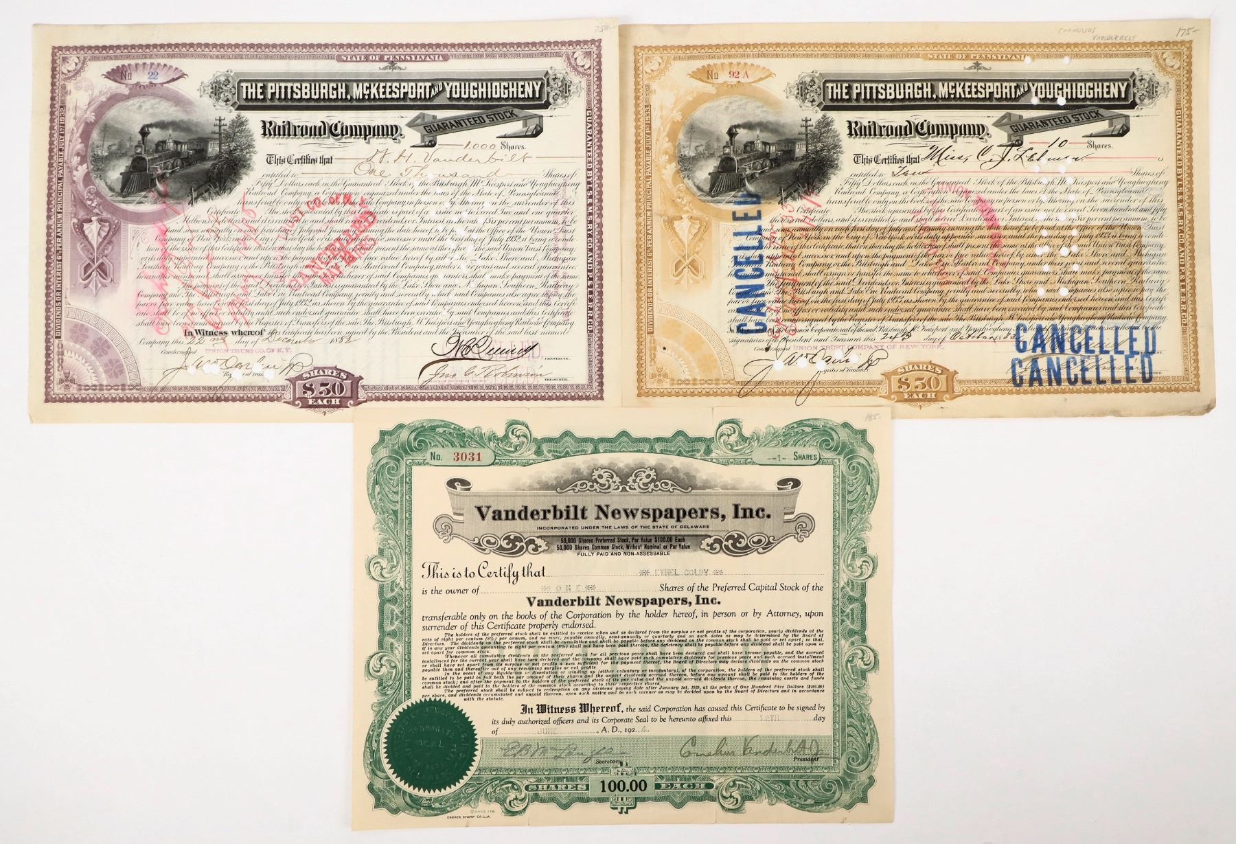 Lot of 3 different. 1-2) Two different Pittsburgh, McKeesport & Youghiogheny Railroad stocks, 1882, one issued to WH Vanderbilt, both signed by CW Vanderbilt on the reverse, punch cancelled. 3) Vanderbilt Newspapers, Inc. stock issued in 1924, signed by Cornelius Vanderbilt Jr. as president. The Vanderbilt family rose to prominence in the 19th century through the efforts of Cornelius "Commodore" Vanderbilt, who built a vast fortune in shipping and railroad industries, becoming one of America's wealthiest individuals. Their wealth and influence expanded through the construction of major railroads, including the New York Central, and through lavish displays of Gilded Age opulence, such as grand mansions in New York and Newport. By the end of the century, the Vanderbilts were a symbol of both immense industrial success and the excesses of America's emerging aristocratic elite.