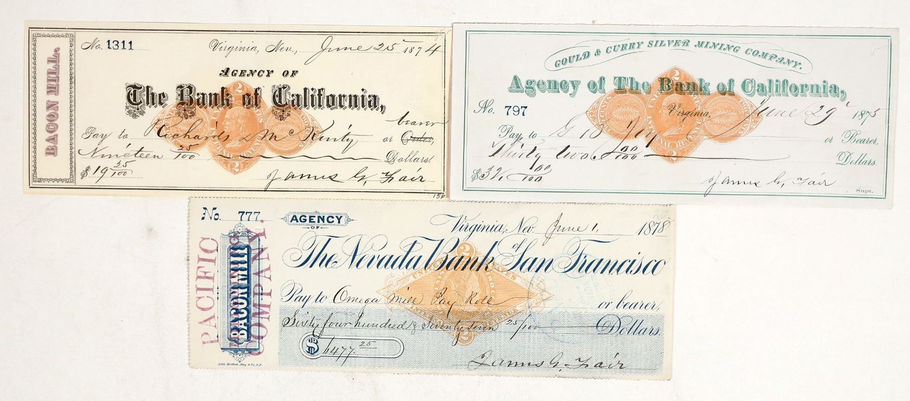 Lot of 3 different signed by James G. Fair. Fair was one the four "Bonanza Kings", mining millionaires on the Comstock. He also served as a US senator for Nevada. 1) 1874 Bacon Mill to Richards & McKinty, RN-D. The Bacon Mill was located in Silver City at the intersection of Gold Canyon and American Ravine. It was built in 1862. In 1865, it was processing ore from the Bacon Mine in Gold Hill. By 1868, it was controlled by William Sharon and the Bank of California. In 1869, Fair and Mackay bought it to process Hale & Norcross mine ore. In 1871, it was reported to have 20 stamps and a 40 ton daily capacity. [Ansari]. 2) 1875 Gould & Curry to GB Joy, RN-D. The Gould & Curry is one of the most famous mines on the Comstock Lode. Located between the Savage and Best & Belcher mines, it was staked in 1859 after being located by Alva Gould and Abraham Curry. They sold out early and Curry went on to be a central figure in Carson City (he was the first superintendent of the Carson City Mint and the first warden of Nevada State Prison). When the company was incorporated in 1860, George Hearst was one of the incorporators and William C. Ralston was treasurer. The mine was a large producer in the early 1860s and the company erected an incredibly expensive mill in Sevenmile Canyon in 1863. Between 1860-81, production was 314,000 tons yielding over $15 million. 3) 1878 Pacific Mill & Mining Co. to Omega Mill Pay Roll, RN-D. Nice trio in very good condition. The Pacific Mill & Mining Company was established by the "Bonanza Firm" (Mackay, Fair, Flood, and O'Brien) in the 1870s. The Bonanza Firm challenged the broad control Ralston and Sharon exercised over the Comstock Mines, backed by the Bank of California, by joining their finances in various stock operations and transactions, leading to the formation of a new group of mining corporations. They purchased all the major mine suppliers, and in 1877 the group established an "independent" mill, the Pacific Mill and Mining Company, which was wholly owned by the "Bonanza Firm" and incorporated under the Laws of California. The company owned a number of other mills in the Comstock area including the Bacon Mill, Brunswick Mill, California Mill, California Pan Mill, Consolidated Mill, Mariposa Mill, Morgan Mill, Occidental Mill, Omega Mill, Rhode Island Mill, Trench Mill, and the Woodworth Mill/Ditch.