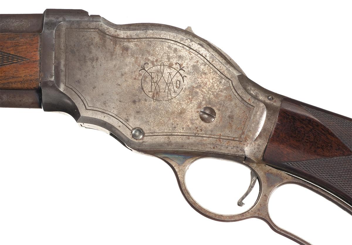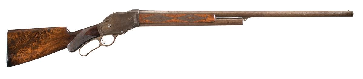 Manufactured in 1887, the first year of production. Single brass bead sight on an unmarked barrel, with cylinder choke and 2 1/2 inch chamber. Large "WRACo" monogram on the left side of the border line engraved receiver, three digit serial number on the underside, and three line address on the lower tang followed by one line of patent dates. Fancy checkered stock, with an attractive tiger stripe pattern on the two-slab checkered forearm and attractive feathering on the buttstock. Length of pull is 13 inches.