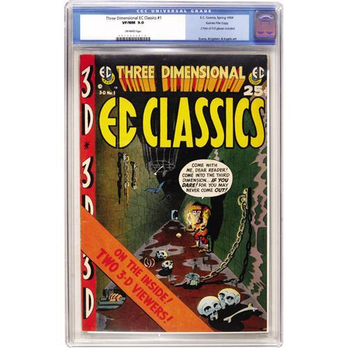 <B>Three Dimensional EC Classics #1 Gaines File pedigree (EC, 1954) CGC VF/NM 9.0 Off-white pages.</B></I> Overstreet notes that this issue is "rare in high grade", and, sure enough, CGC hasn't certified a higher-graded copy than this, pretty amazing when you consider the abundance of Near Mint and better Gaines File Copies that exist for other issues. The cover is by Harvey Kurtzman, while interior stories are by Wally Wood, Bernie Krigstein, George Evans, and Graham Ingels. While CGC has certified this as a Gaines File Copy, no certificate accompanies the lot. Overstreet 2006 VF/NM 9.0 value = $878; NM- 9.2 value = $1,225. CGC census 3/07: 2 in 9.0, none higher.<BR><BR><b>Shipping:</b> Comics - Slabbed (certified) (<a target="_blank" href="http://www.heritageauctions.com/common/shipping.php">view shipping information</a>)