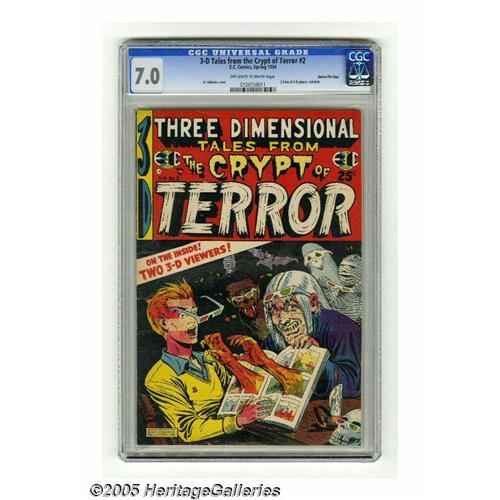 <B>Three Dimensional Tales from the Crypt of Terror #2 Gaines File pedigree (EC, 1954) CGC FN/VF 7.0 Off-white to white pages.</B></I> This one-shot featured stories from " <B>Tales From The Crypt</B></I> and "<B>Vault of Horror</B></I> that were redrawn to the 3-D format by Jack Davis, Will Elder, Johnny Craig, and Joe Orlando. The cover is by Al Feldstein. And to our relief, CGC notes, ""2 pairs of 3-D glasses included."" Note that while CGC has certified this comic as a Gaines File copy, no certificate accompanies this lot. Overstreet 2005 FN 6.0 value = $267; VF 8.0 value = $556. CGC census 9/05: 1 in 7.0, 8 higher. <BR><BR><B>Important notice:</B> Heritage usually auctions material at the rate of 200-250 lots per hour. On some occasions eBay Live bid software or the Internet may not be able to keep up with the pace of the auction. We recommend placing a realistic absentee bid now as insurance to avoid disappointment. Occasionally the auctioneer may eliminate or reject an eBay Live bid, and the auctioneer may also reopen a lot after the close of the eBay live bidding (usually because we missed an audience bid), and may reject your bid even if it shows you as the winning bidder. By bidding via eBay Live, you agree that Heritage may award the lot to another bidder at its sole discretion under the circumstances described above or any other reasonable circumstances. Since eBay bids are not shown to us until we open the lot on the floor, we treat those bids just like floor bids. In most cases the floor responds before the eBay bid is presented to us, due to Internet lag time, so for consistency we have made it a policy that floor bids are always considered first over tie eBay live bids. Also please note that all Heritage lots purchased through eBay Live carry a 20% Buyer's Premium. Please make sure you read the Terms and Conditions before you bid. This lot is being auctioned in conjunction with a live floor auction by Heritage Galleries & Auctioneers. All final auc