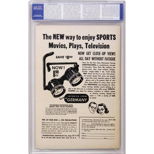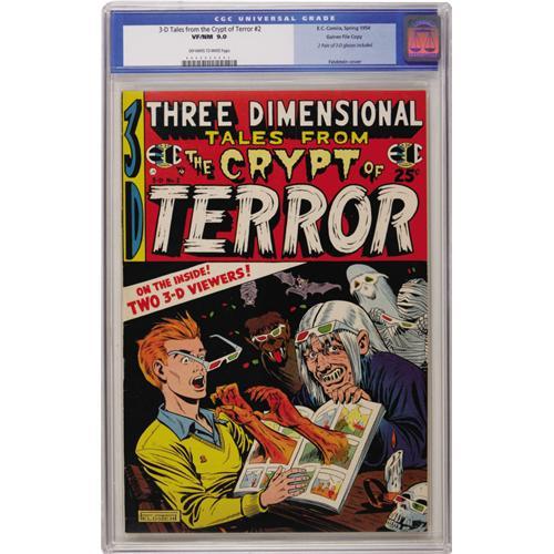 <B>Three Dimensional Tales from the Crypt of Terror #2 Gaines File pedigree 1/12 (EC, 1954) CGC VF/NM 9.0 Off-white to white pages.</B></I> Seemed like such a great idea, taking the EC concept one more step by adding 3-D to amplify the great art and the horror effect; but, alas, this was a one-shot in 1954. Al Feldstein's signature cover opened the way to ghoulish reprints redrawn in the 3-D format. Overstreet indicates this issue is rare in high-grade, so you're obviously looking at a rare book here. This one contains two pairs of 3-D glasses, and it sports the second-highest grade yet assigned to a copy of this issue by CGC. Overstreet 2006 VF/NM 9.0 value = $878; NM- 9.2 value = $1,200. CGC census 10/06: 3 in 9.0, 1 higher.<BR><BR><b>Shipping:</b> Slabbed Comic (<a target="_blank" href="http://www.heritageauctions.com/common/shipping.php">view shipping information</a>)
