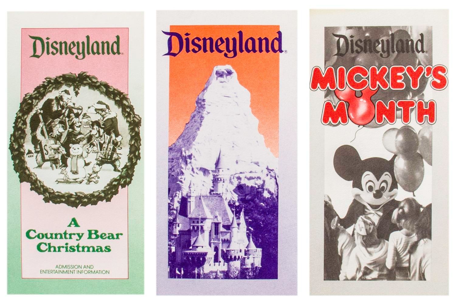 (Disneyland, 1984) Three 1984 Disneyland brochures showcasing the Matterhorn, Mickey's Month, and A Country Bear Christmas. Measuring 3.5" x 7" each, the brochures are in very good condition with light discoloration from age and staple marks on the back covers.