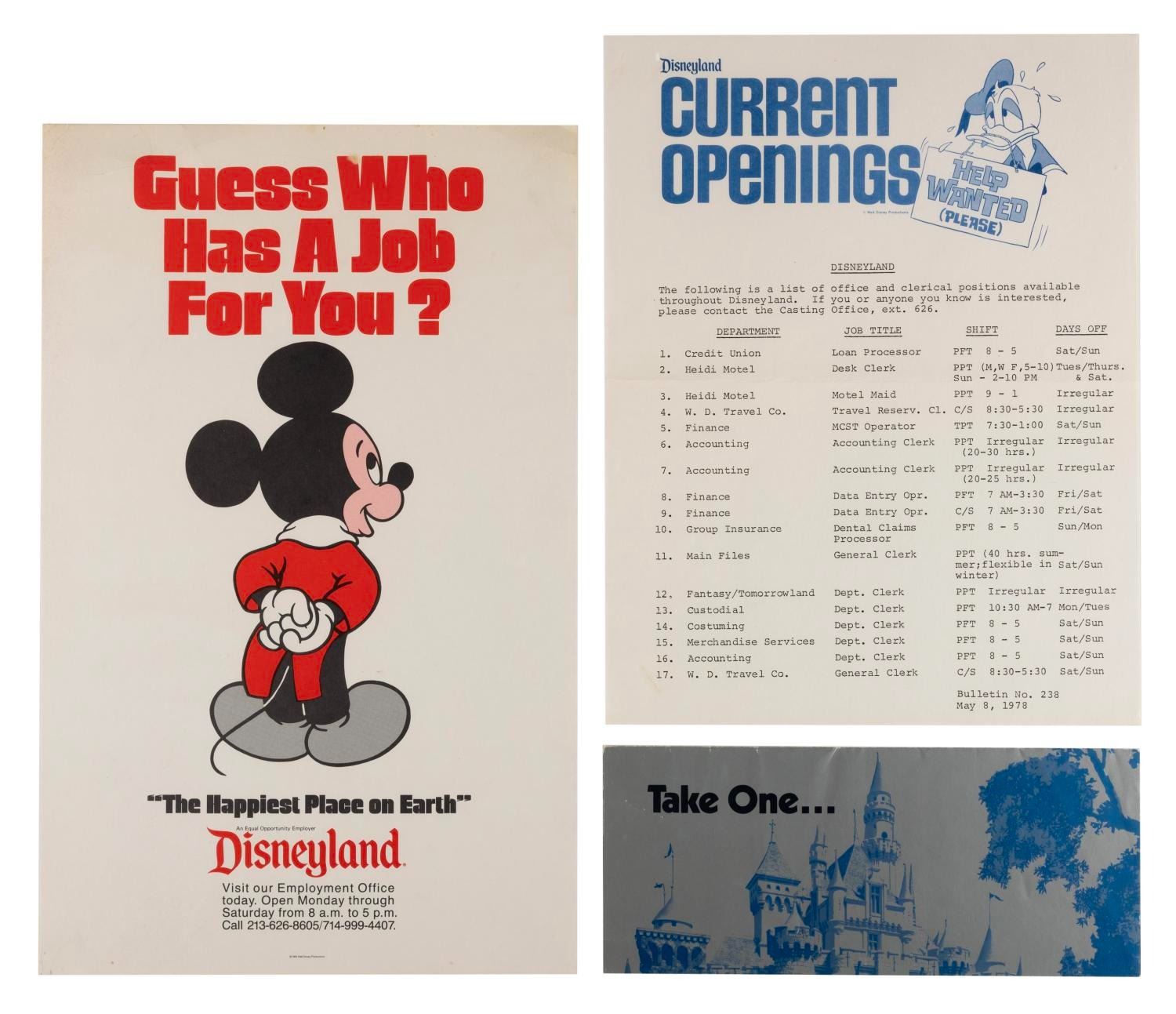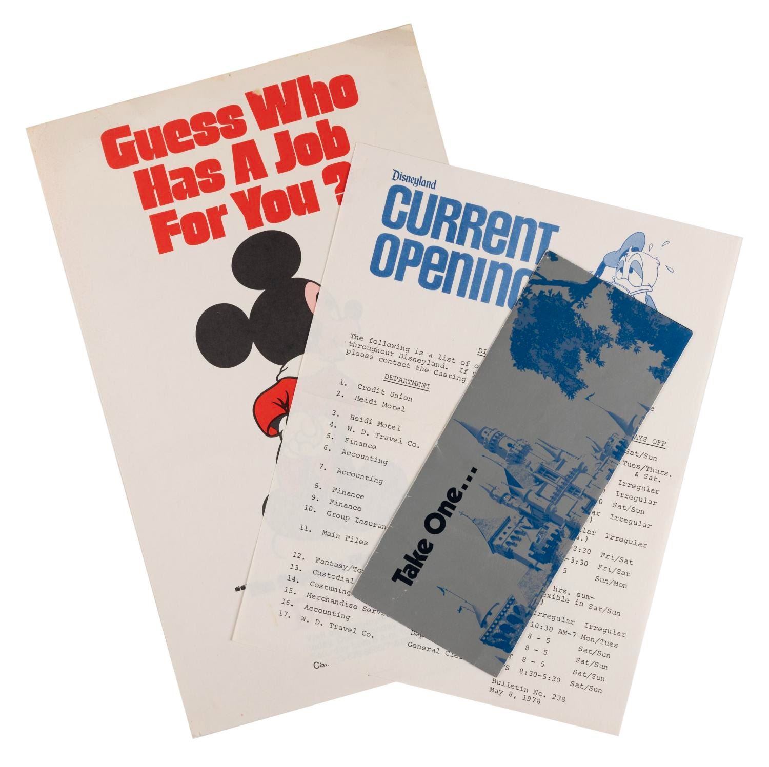 (Disneyland, 1978-1980s) Three Disneyland employment items including a flyer listing current Cast openings, a Casting call poster, and a fold-out pamphlet providing a brief overview of employment at the Park. Measuring from 3.5" x 8.5" up to 8.5" x 11", the items are in good condition with handling wear and a fold across the top of the pamphlet, and a small crease, edge wear, and spot of discoloration to the poster.