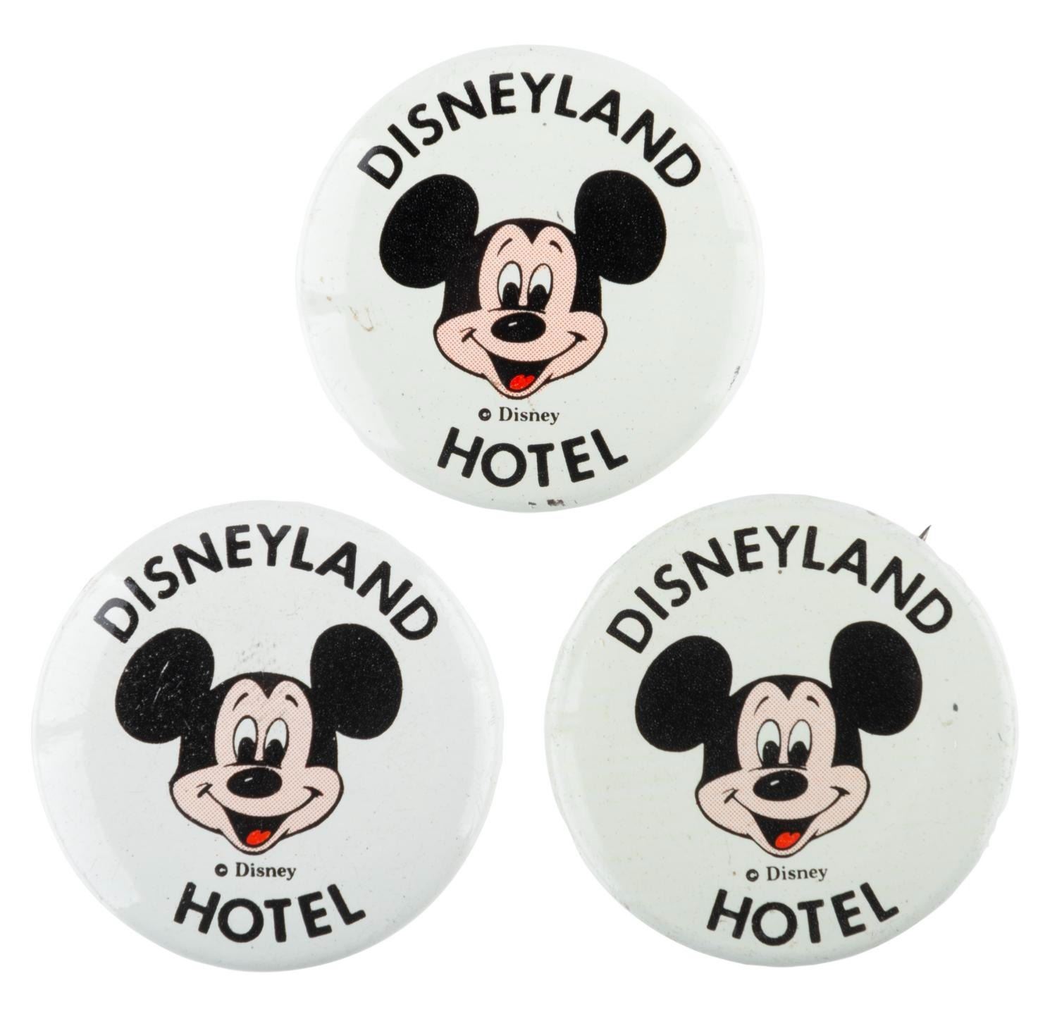 (Disneyland Hotel, 1980s) Three souvenir pinback buttons from the Disneyland Hotel, featuring Mickey Mouse. Measuring 1.25" in diameter each, the buttons are in very good condition with light scratches and scuffs.