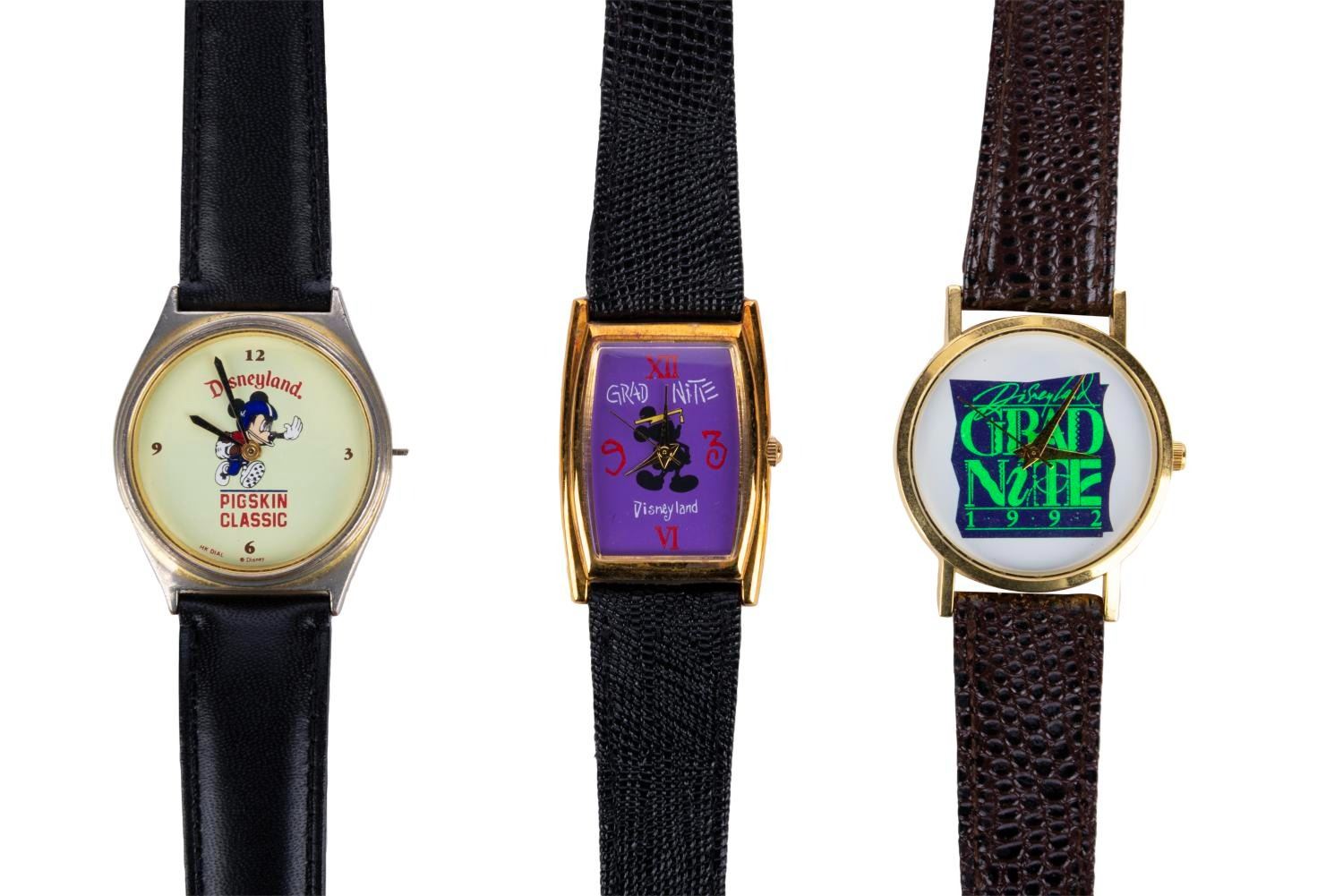 (Disneyland, 1992-94) Three Disneyland special event souvenir watches, Including two from Grad Nite 1992 and ‘93, and the Disneyland Pigskin Classic. With faces measuring 1” x 1.25” to 1.25” in diameter and 9” leather bands, the watches are all in fine condition, requiring new batteries and possibly service to function.